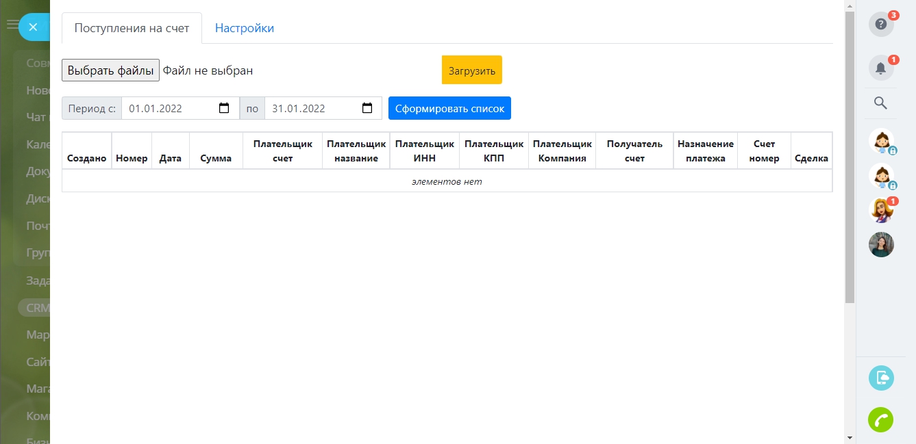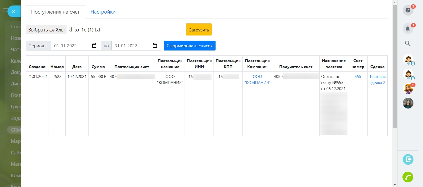 После загрузки, Поступления на счет отображаются в виде таблице на странице приложения, со ссылками на компании, сделки и счета вашей CRM.