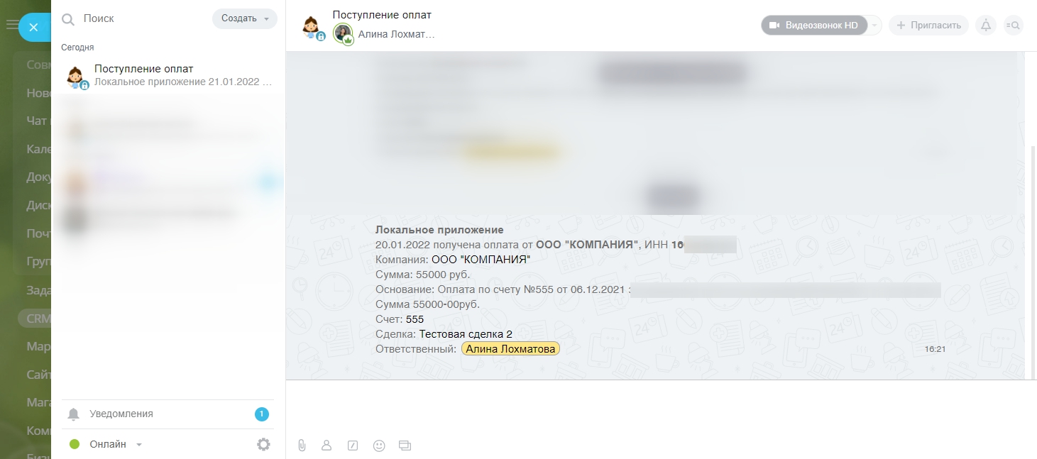 Этот чат будет создан автоматически при установке приложения. По умолчанию в чате только тот пользователь, который установил приложение. Для того, чтобы другие сотрудники видели оповещения об оплатах, добавьте их в чат.