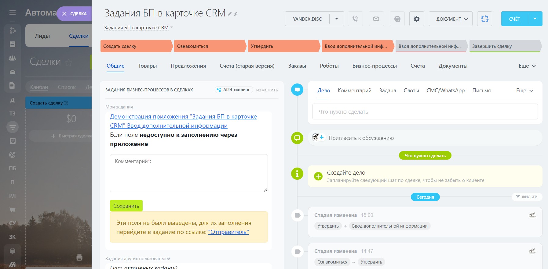 Обратите внимание, что не все поля доступны к заполнению через приложение. В этих случаях в поле Мои задания в карточке сделки вы увидите соответствующее сообщение: