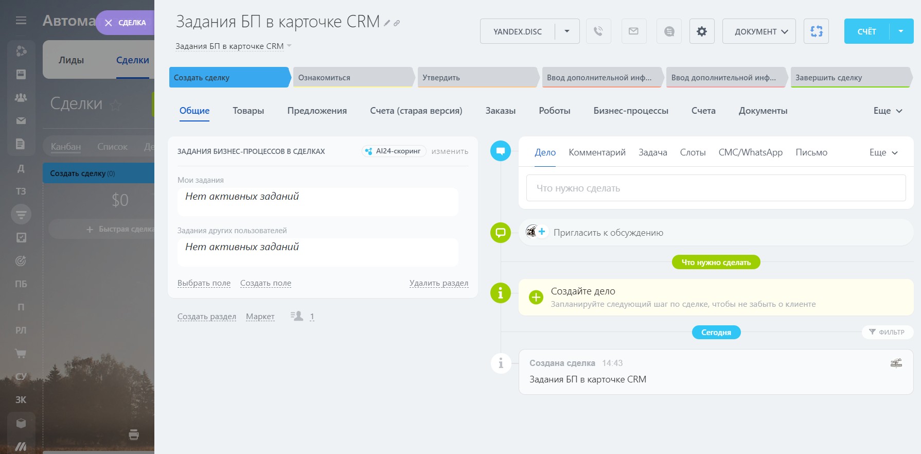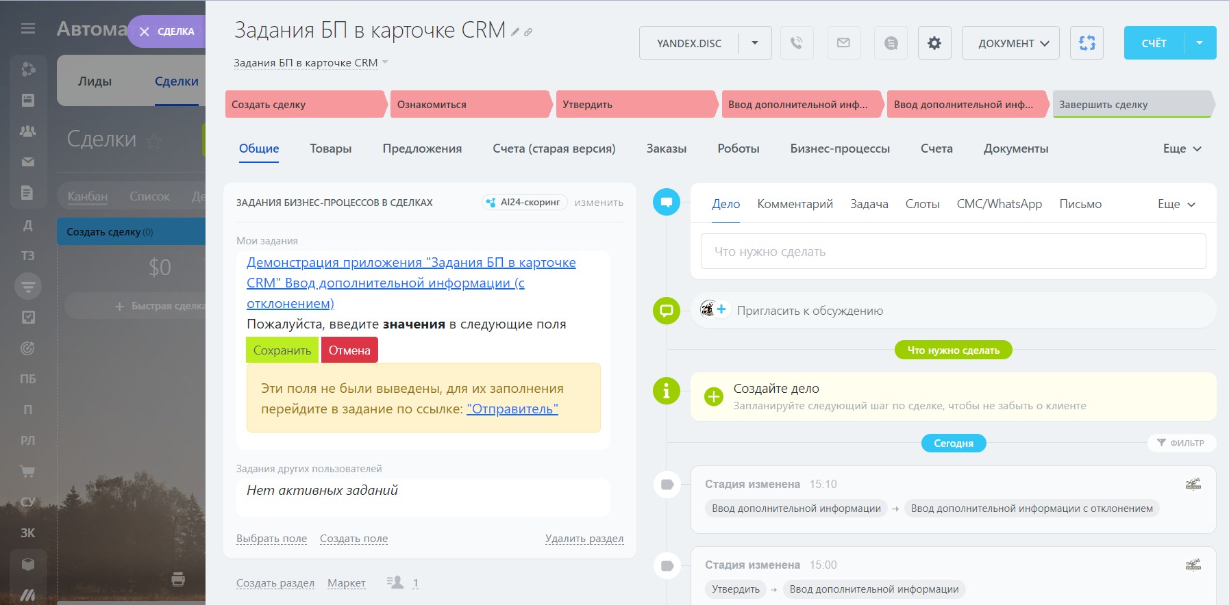 Если на данном этапе по данной сделке отсутствуют задания бизнес-процессов, в полях приложения в карточке вы увидите об этом запись:
