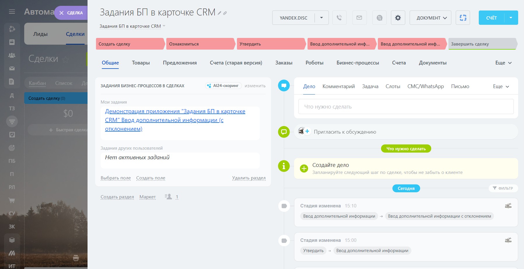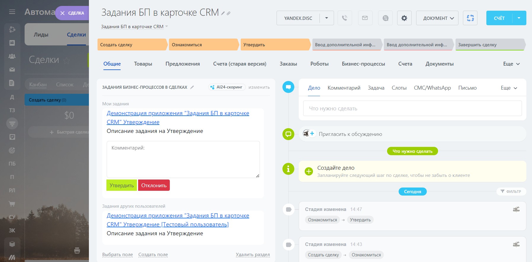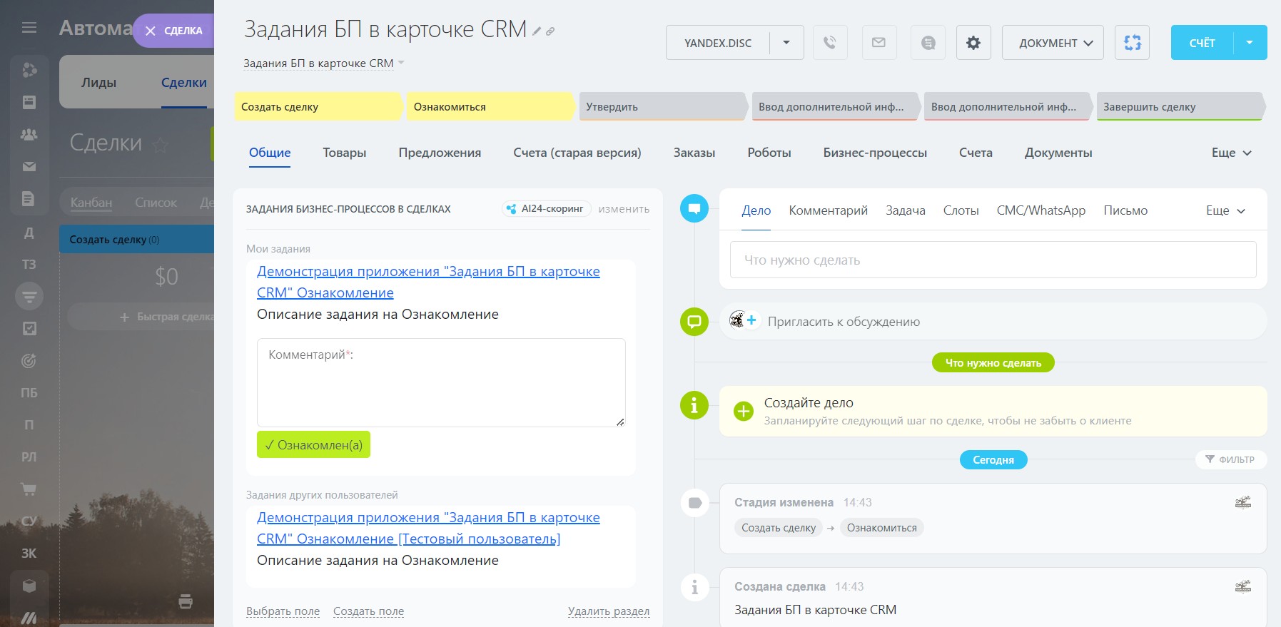 Использование приложения “Заданий БП в карточке CRM” доступно для сущностей: Лиды, Сделки, а также Смарт-процессы: