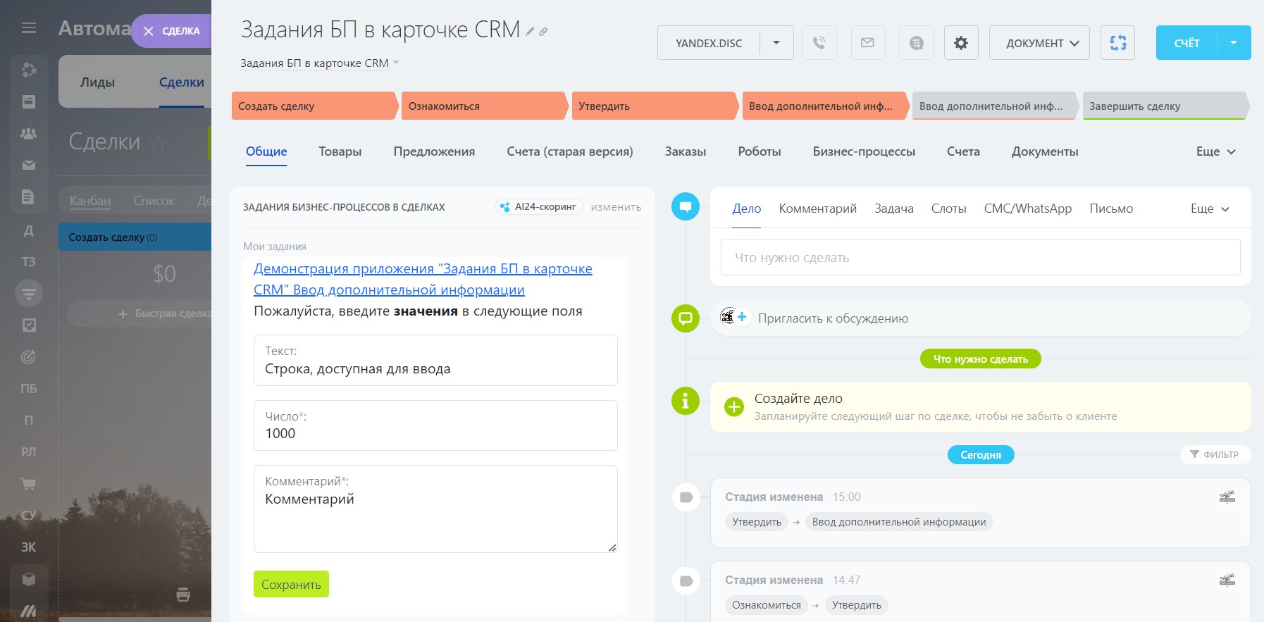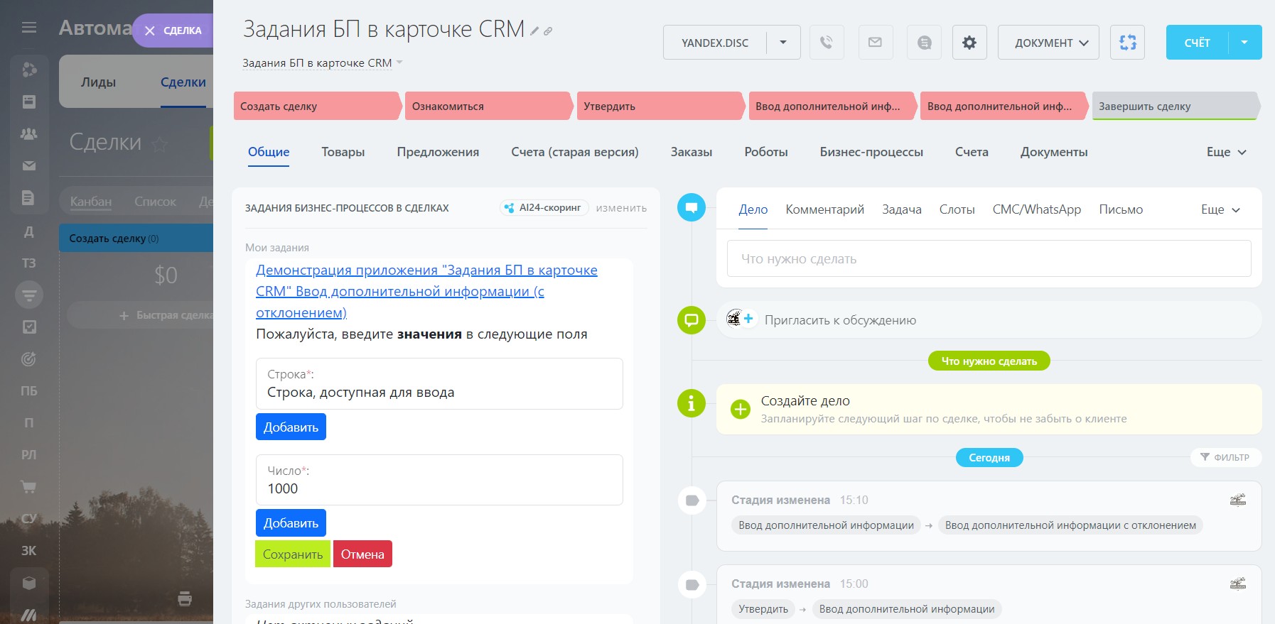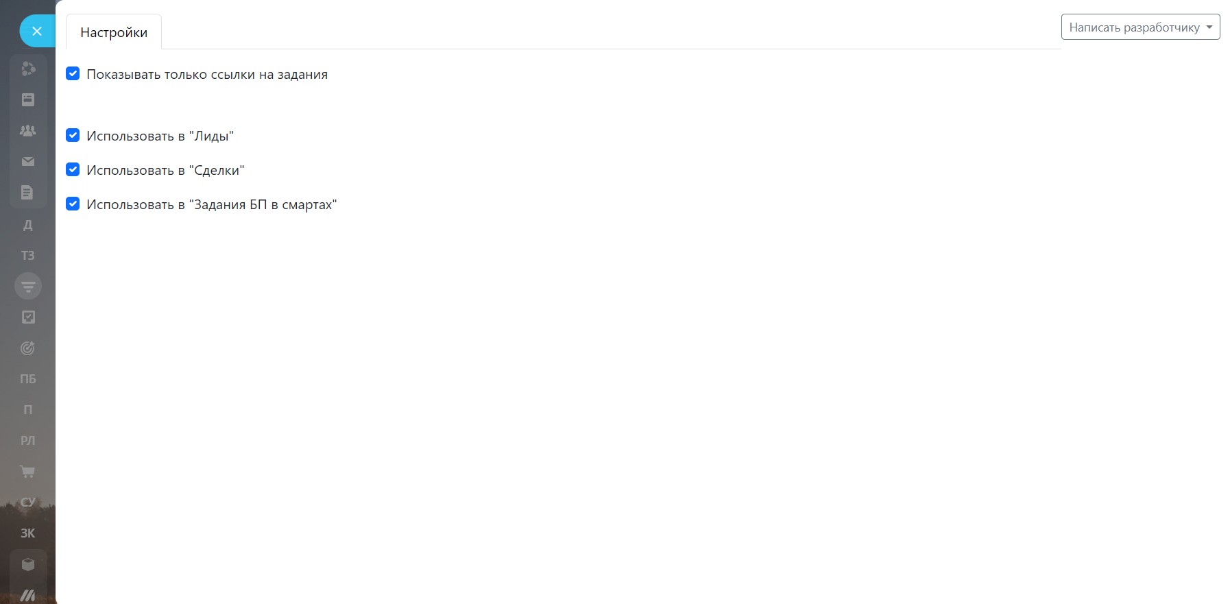 Использование приложения “Заданий БП в карточке CRM” доступно для сущностей: Лиды, Сделки, а также Смарт-процессы: