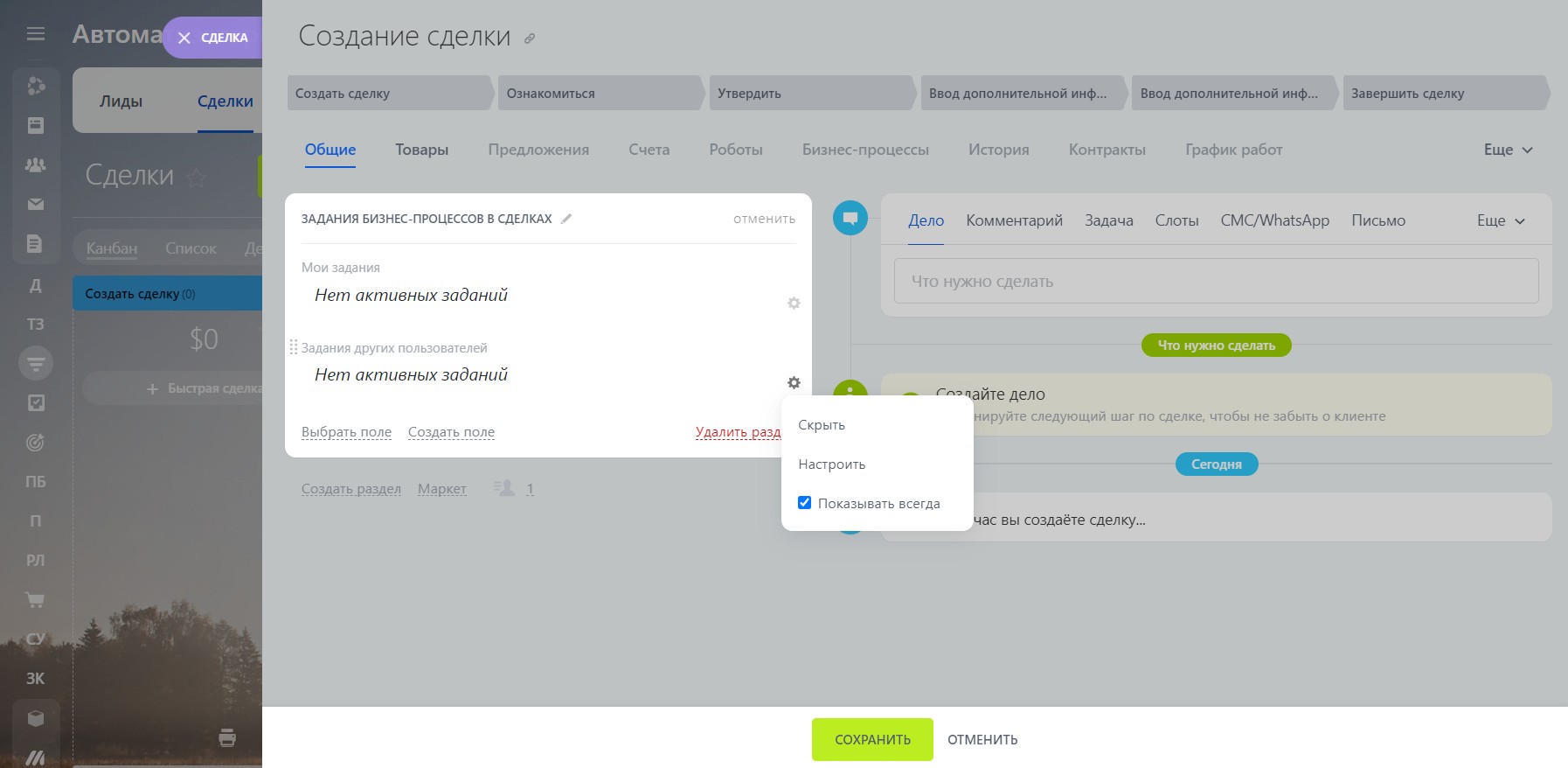 Перед началом работы, необходимо создать раздел в карточке и вывести туда поля приложения: Мои задания и Задания других пользователей. В настройках полей поставьте галочки “Показывать всегда”: