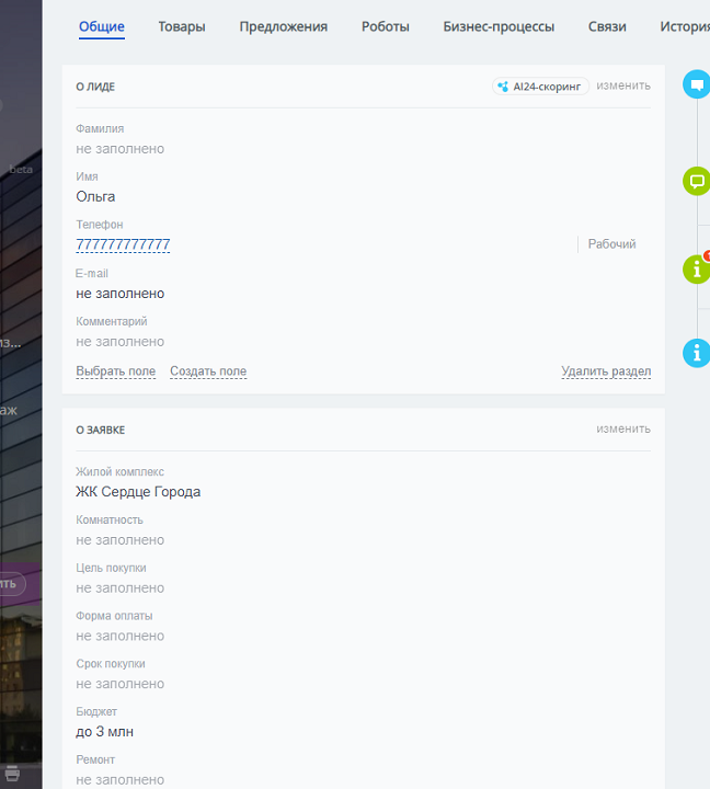 2. Удобная карточка лида, со всеми необходимыми полями для сбора первичной информации