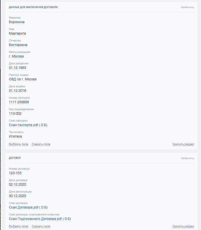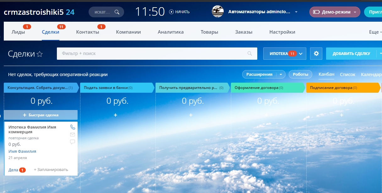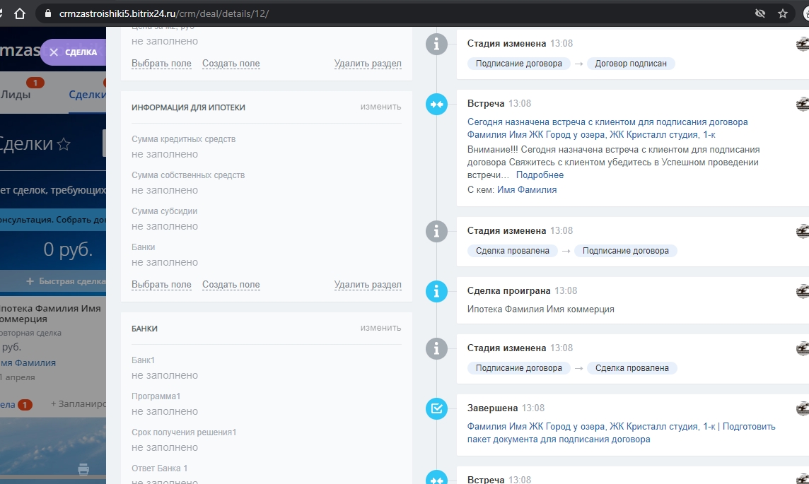 Для воронки Ипотека настроена карточка сделки: