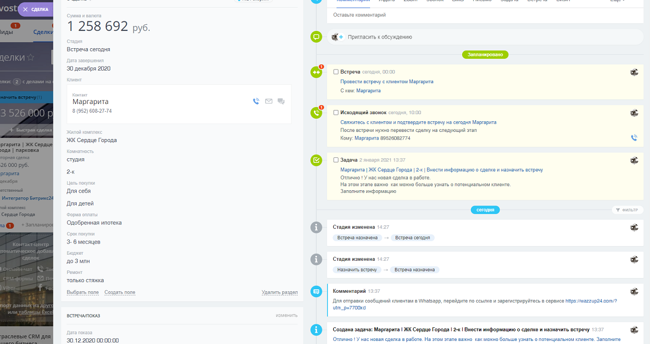 Вся история общения будет сохранена в Битрикс24, вы всегда легко сможете узнать о чем менеджер договорился с клиентом, а при передаче клиента новому сотруднику, сотрудник легко продолжит работу с клиентом. Для подключение WhatsApp мы оставили Вам подсказку в сделках в виде комментария, как показано на картинке.