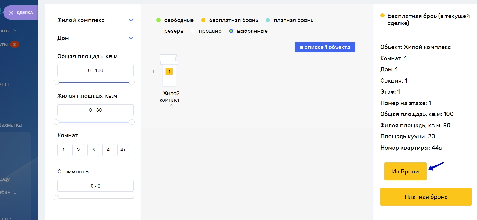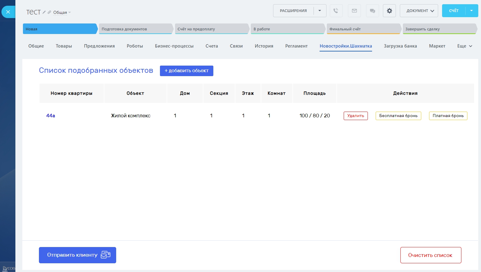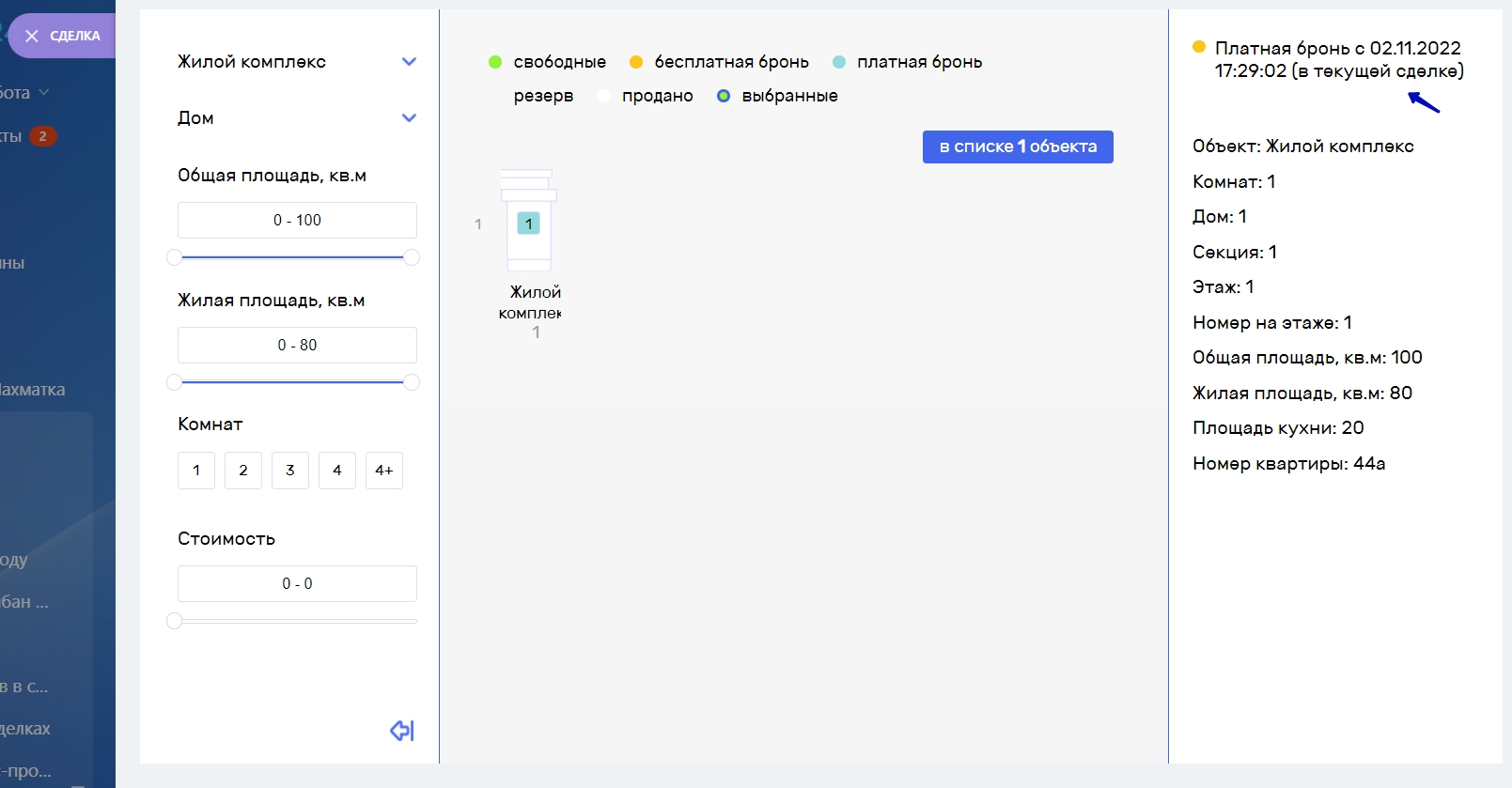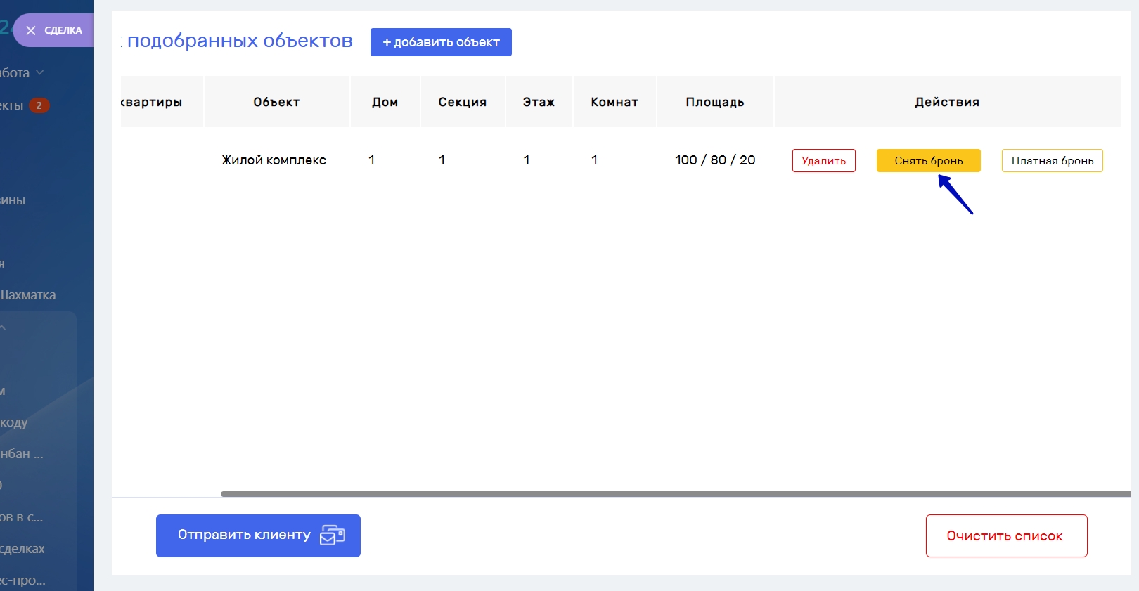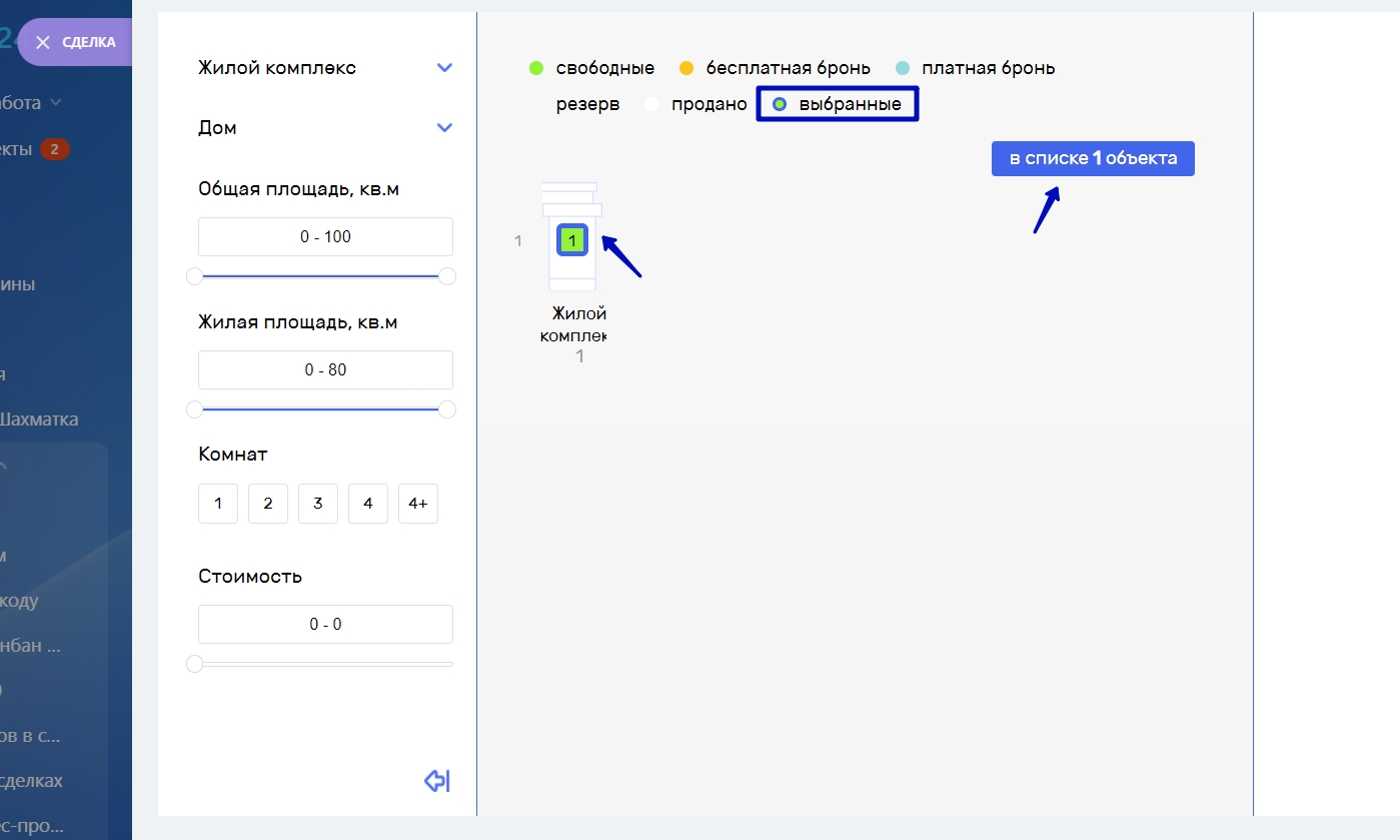 Внимание! Если объект добавлен в список, то он доступен для бронирования в других сделках, если объект забронирован, то он не доступен для бронирования в других сделках.