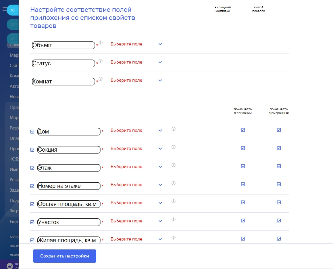 После создания полей, настройте соответствие между полями приложения и свойствами товаров на вашем портале