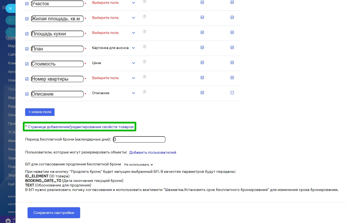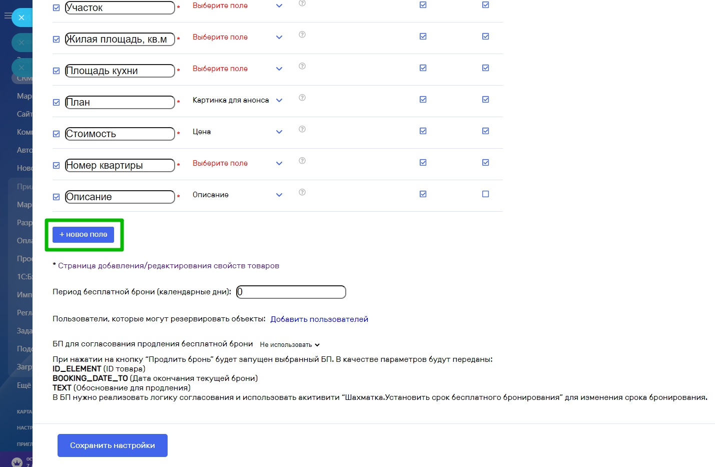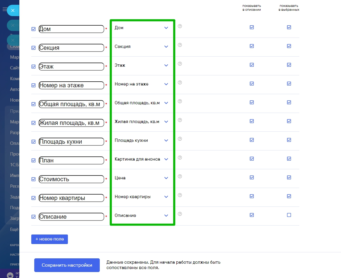 Если в описании ваших объектов есть параметры которые не отражены в списке полей, создайте новые поля кликнув по кнопке “Новое поле”