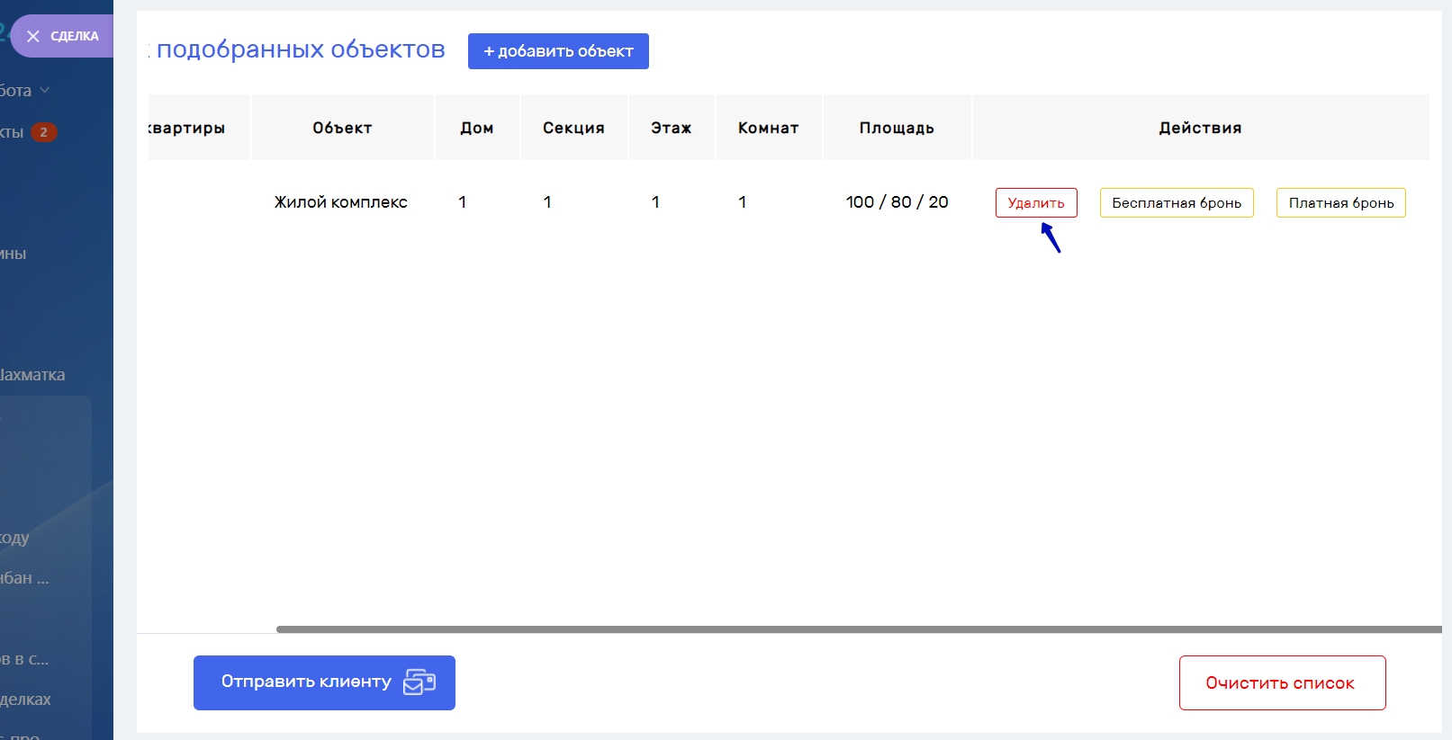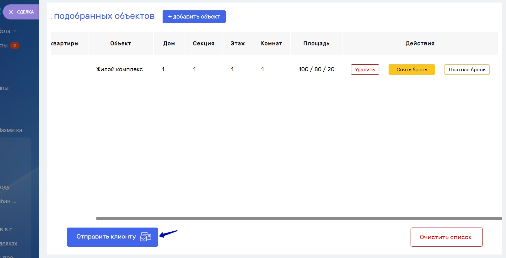 Список подобранных объектов можно отправить на электронную почту клиенту, для этого необходимо в списке объектов нажать кнопку “Отправить клиенту”