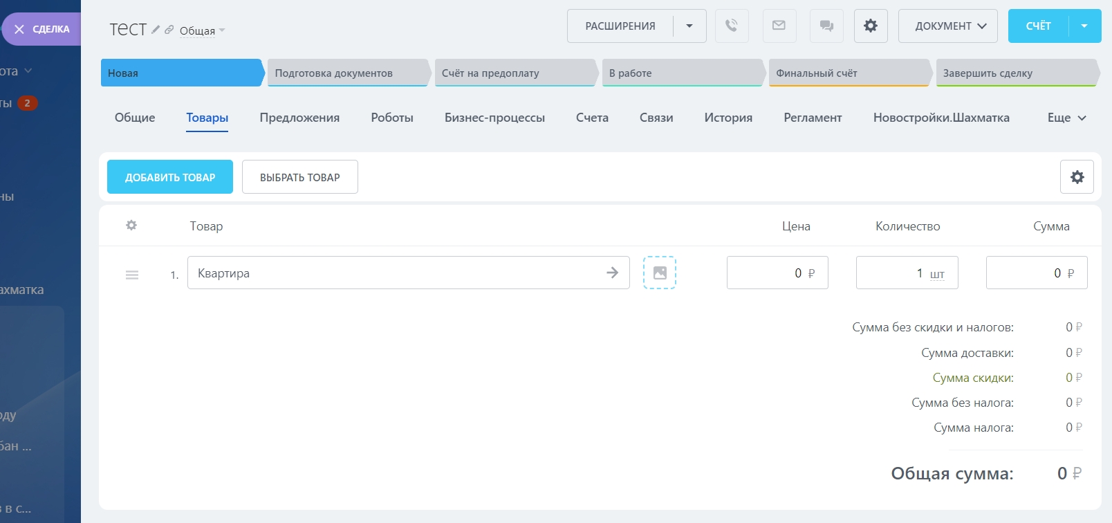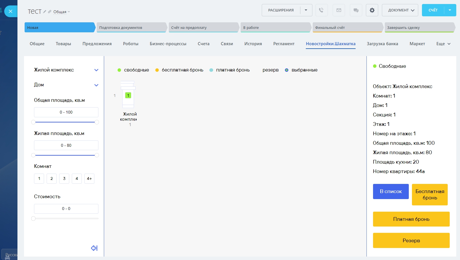 Забронированный объект будет отображаться в сделке на вкладке “Товары”