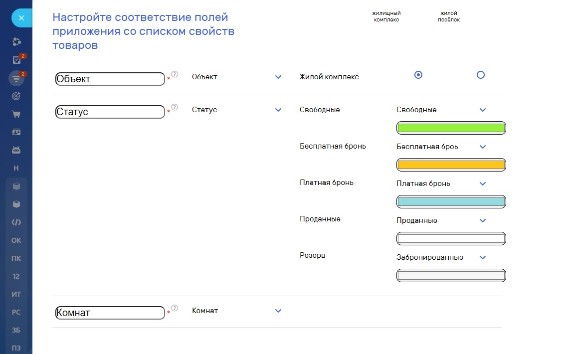 Отдельно обязательно настраивается сопоставление значений для поля “Объект” - для каждого объекта указывается его тип, а также обязательно настраивается сопоставление значений для поля “Статус” - производится сопоставление статусов в приложении и на портале.