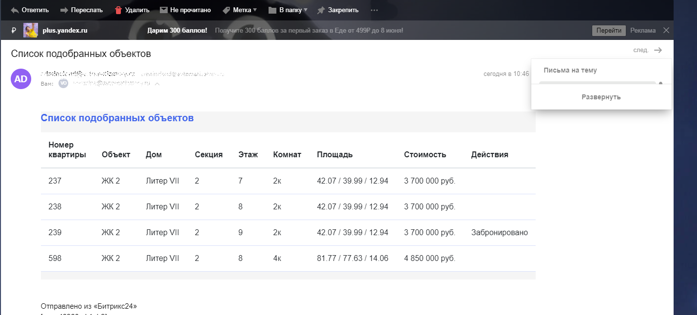 Приложение для подбора квартир. Приложение работает из карточки сделки, имеет возможность отправить клиенту информацию о рассматриваемых квартирах, планировках этих квартир из карточки сделки, имеет возможность выбрать одну из квартир и забронировать ее