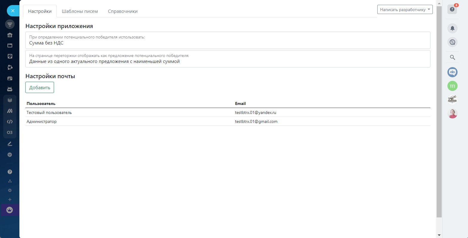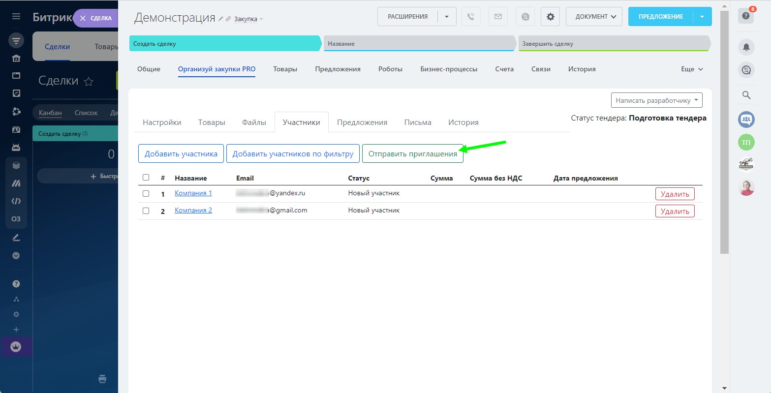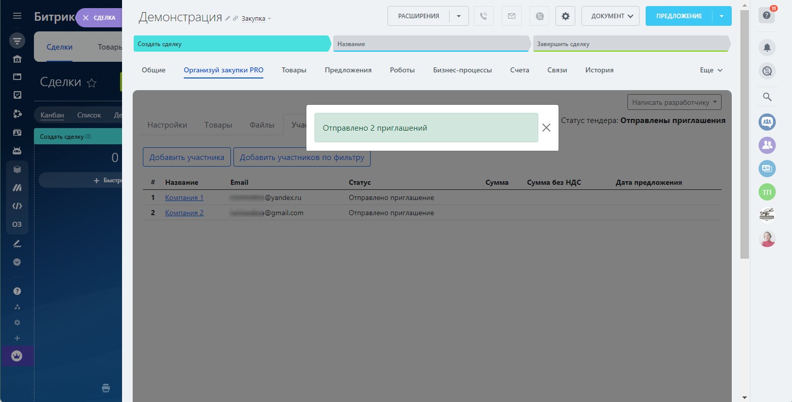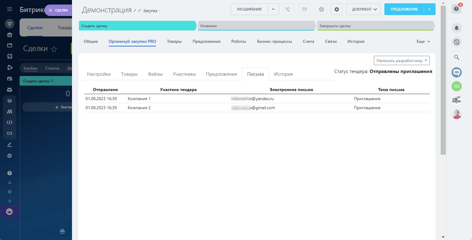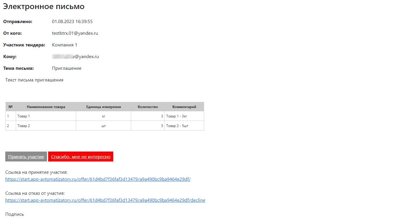 Далее приложение автоматически рассылает всем участникам e-mail с предложением принять участие в тендере