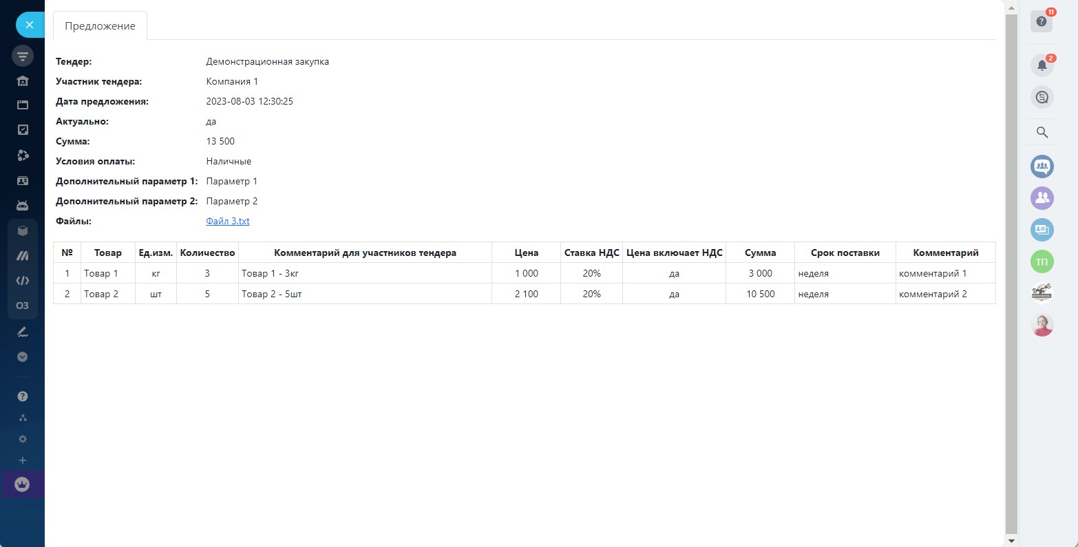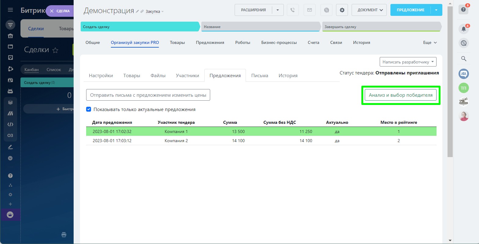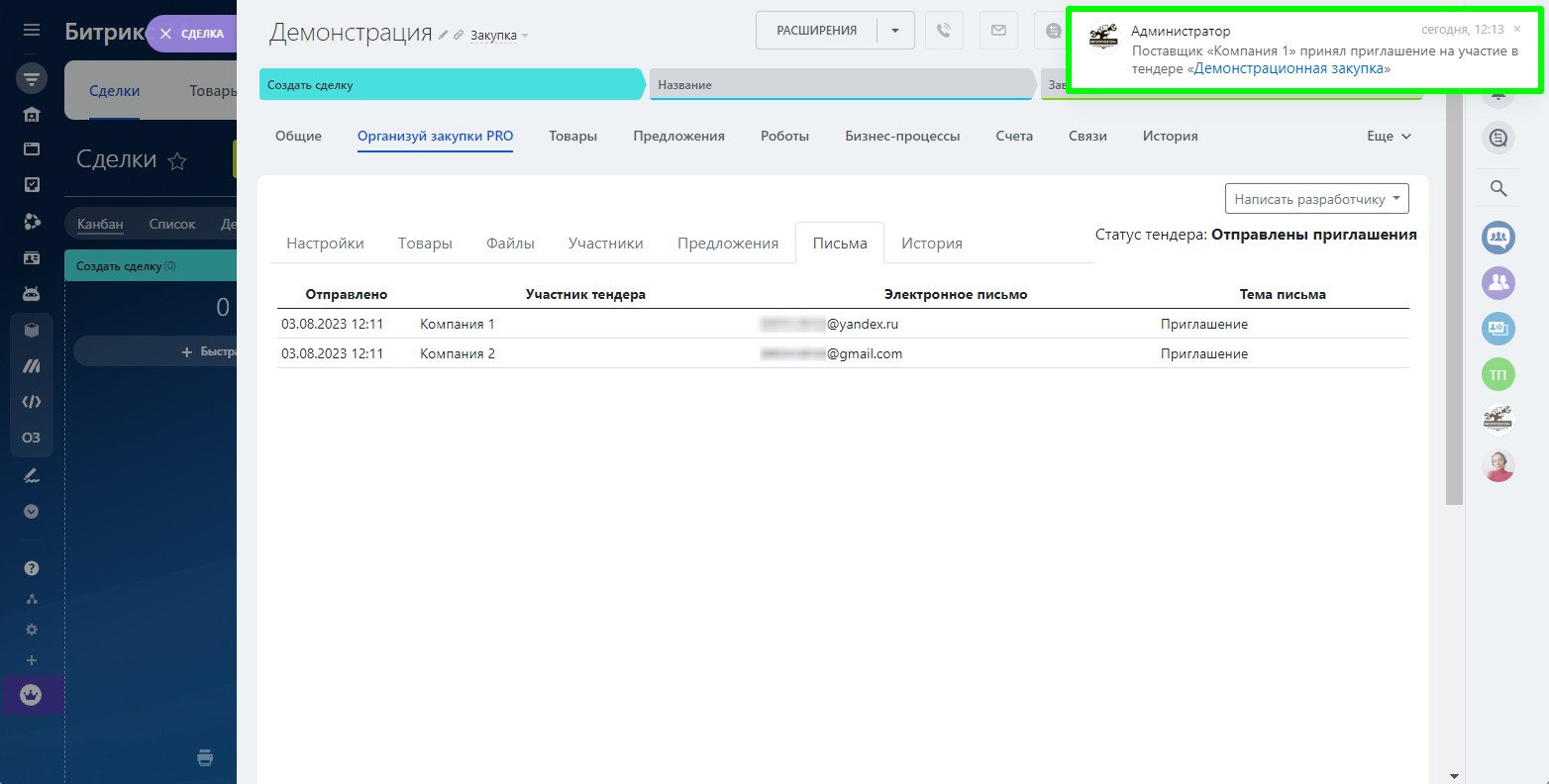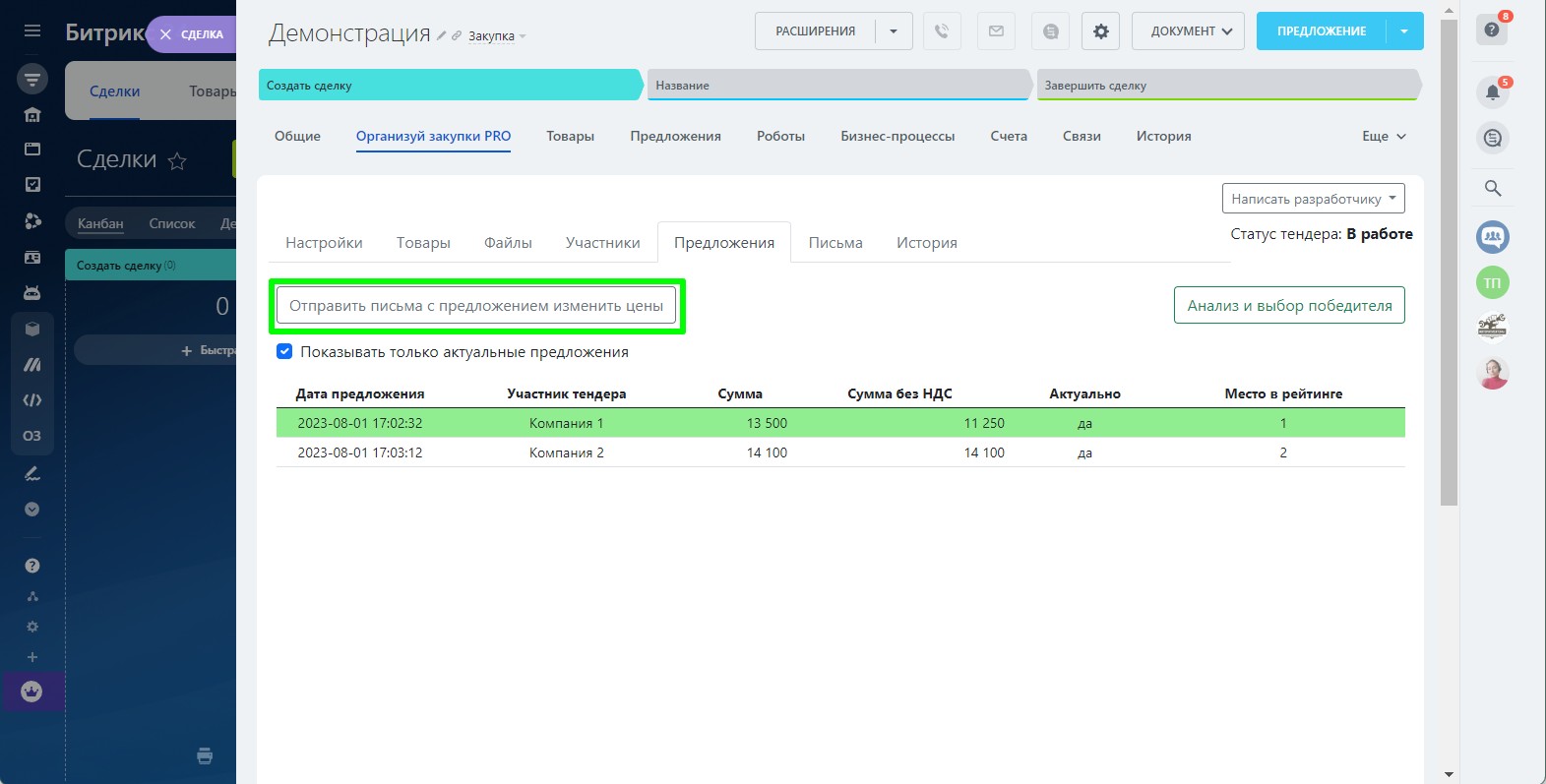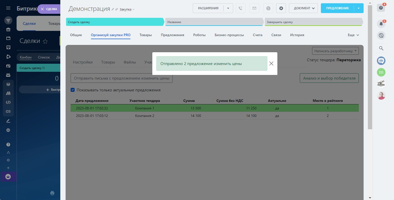 Вы мгновенно получаете информацию о поступившем предложении в Битрикс24 в виде уведомлений и сравнительной таблицы предложений.