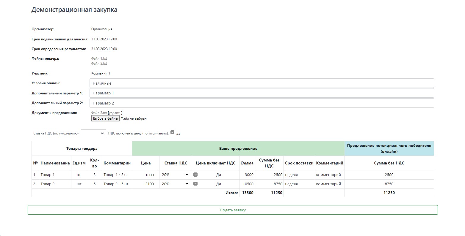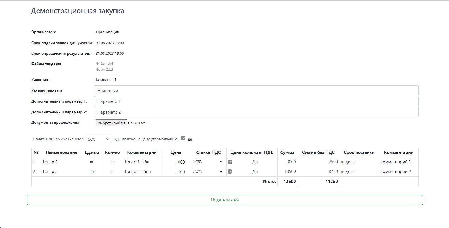 Получив e-mail, потенциальный поставщик переходит по ссылке на специальную страницу приложения и вносит свое предложение о ценах и сроках поставки.