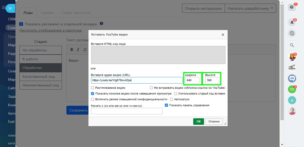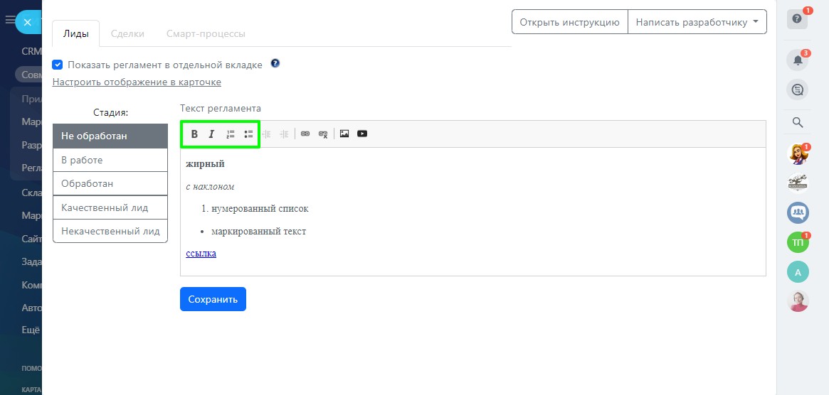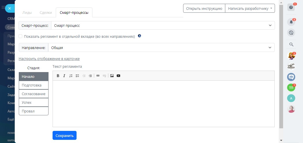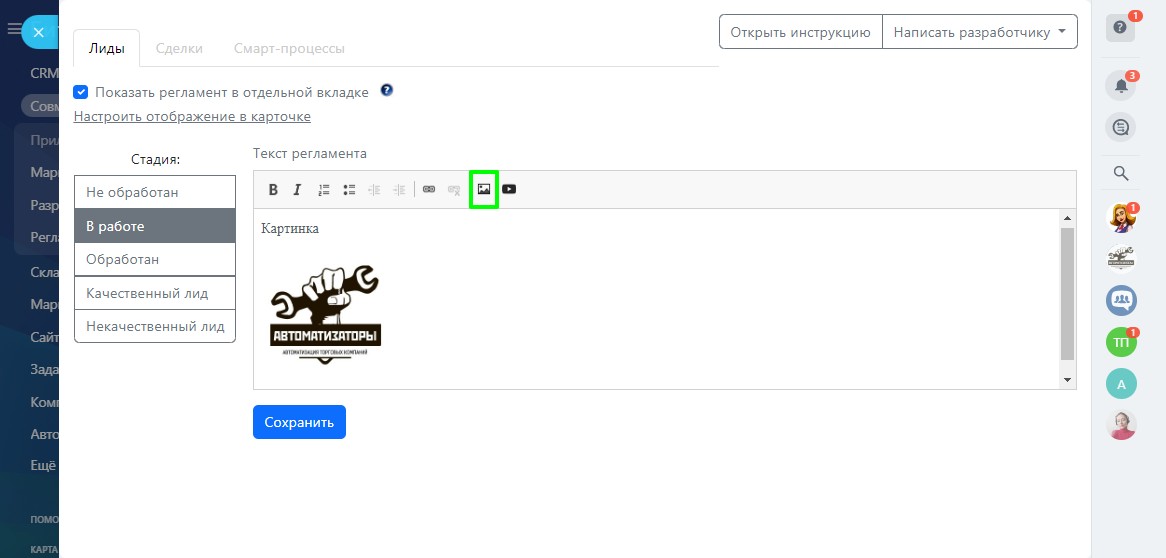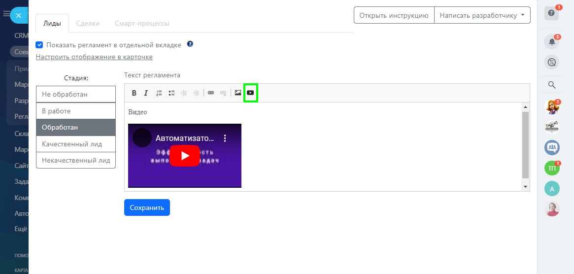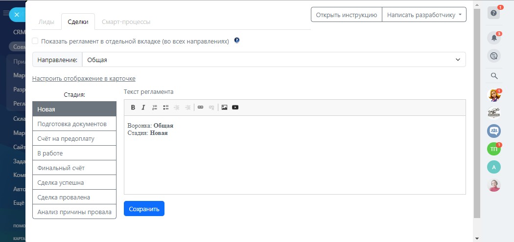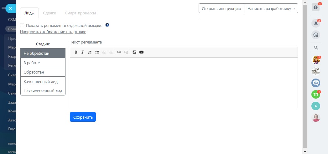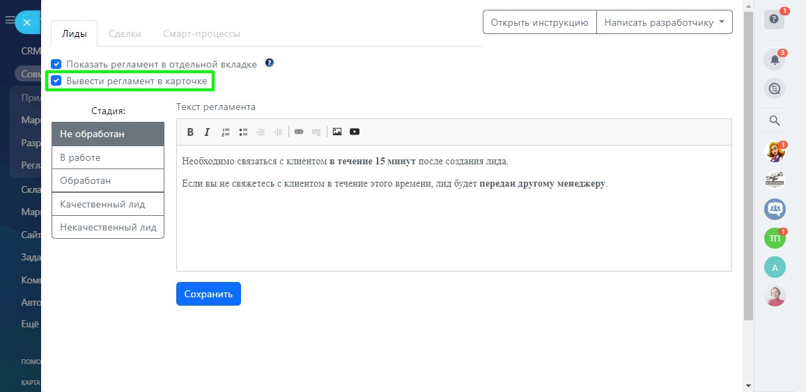 Приложение выводит регламент работы в карточке Лида, Сделки, Счетов и Предложений, а также Смарт-процессов. Для каждой стадии можно настроить отдельный регламент. В текст регламента можно добавлять картинки и видео.