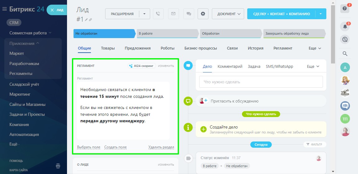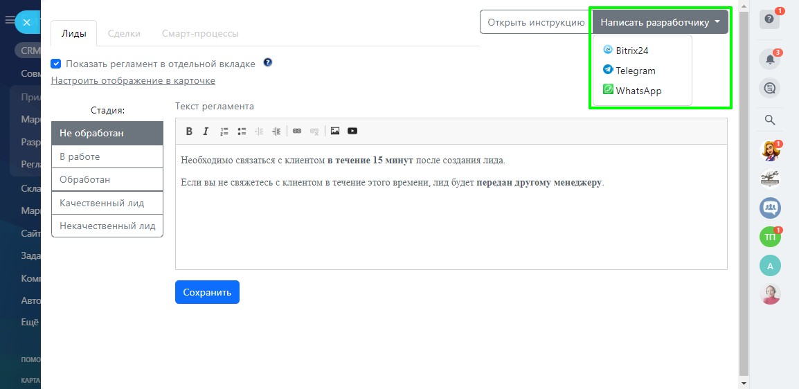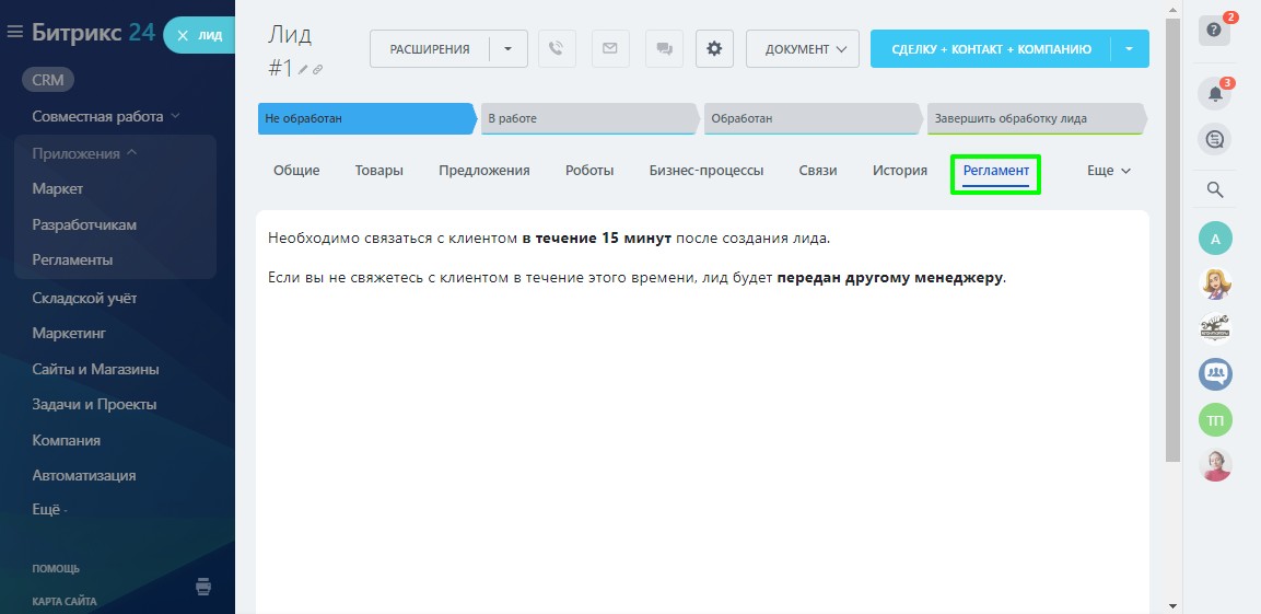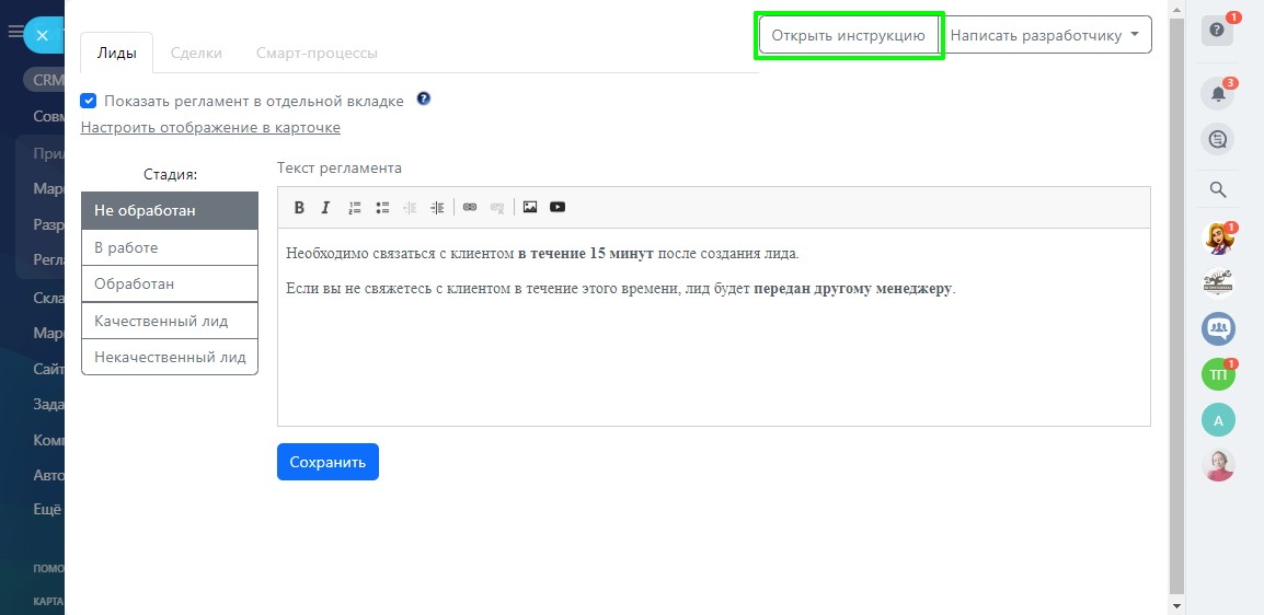 С помощью приложения вы можете вывести регламент работы в карточке Лида, Сделки, Счетов и Предложений, а также Смарт-процессов