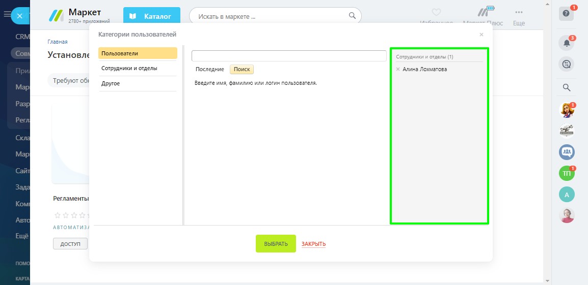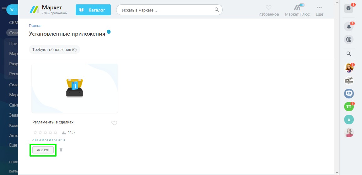 Найти приложение “Регламенты” и нажать кнопку “Доступы”