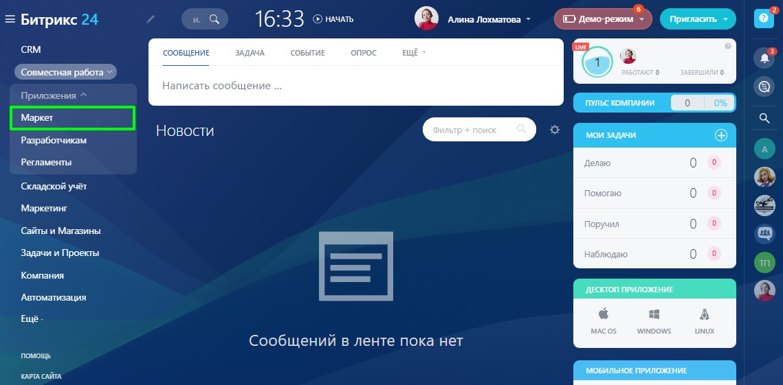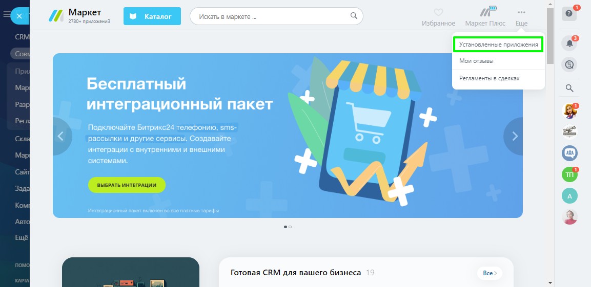 В левом меню Битрикс24 выбрать пункт “Маркет”