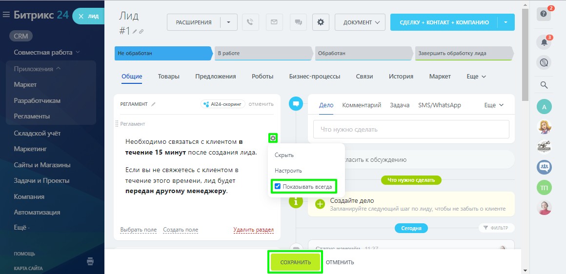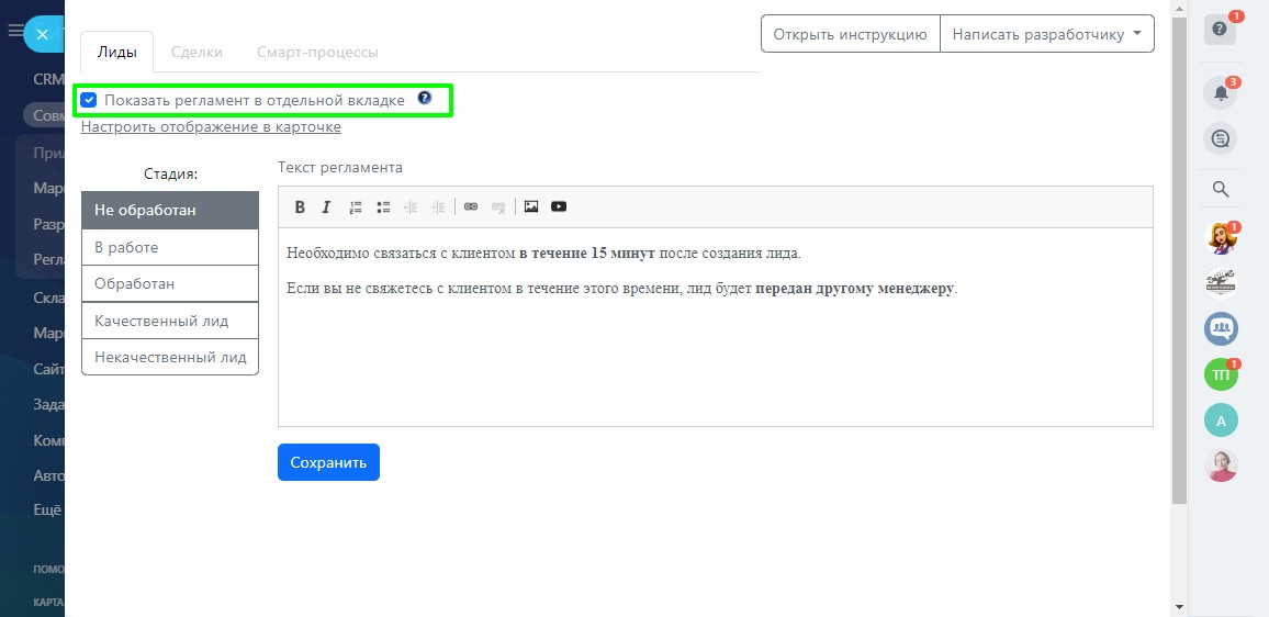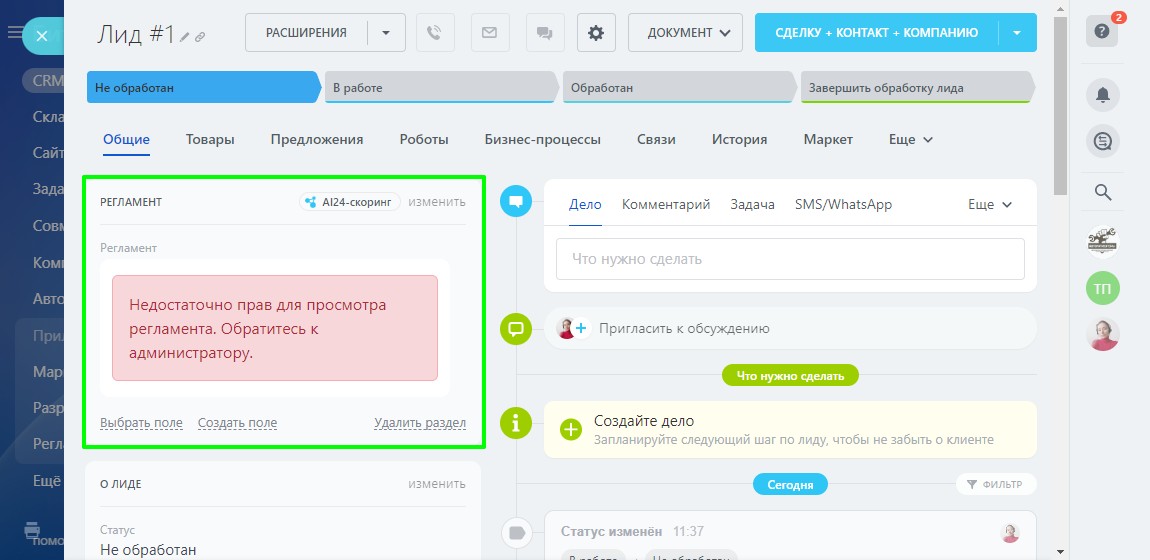 Чтобы отобразить регламент как отдельную вкладку в карточке лида:
