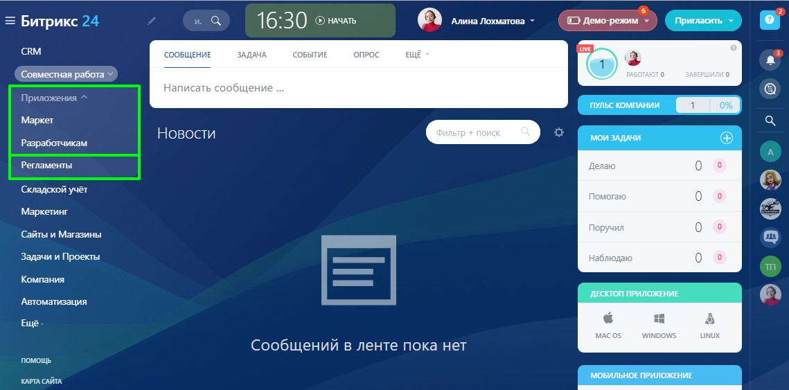 Для того, чтобы добавить новый или изменить существующий регламент, откройте страницу приложения из раздела “Приложения” в левом меню Битрикс24