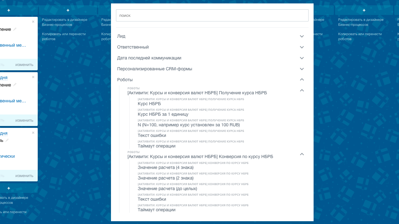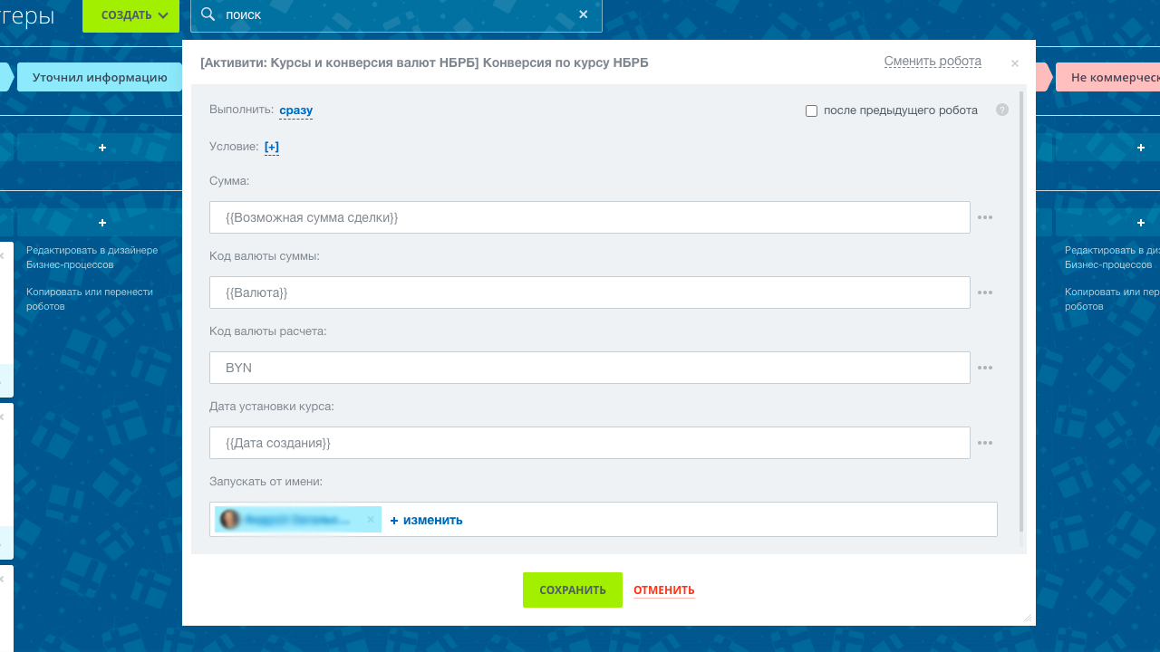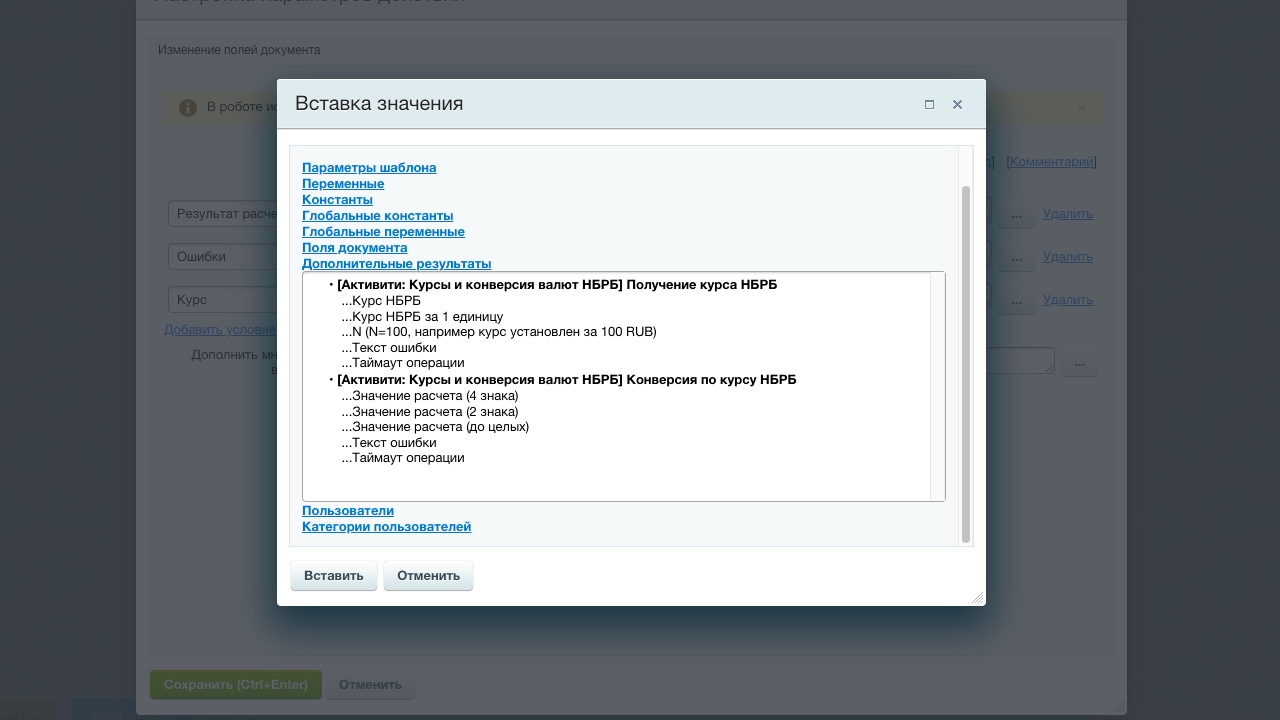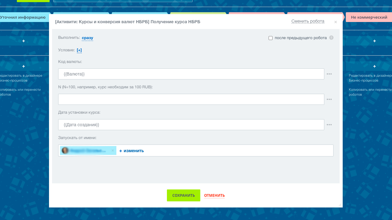 Добавляет 2 активити в бизнес процессы и 2 робота, позволяющих получать курсы валюты по коду и дате либо конвертировать сумму из одной валюты в другую по курсам НБРБ