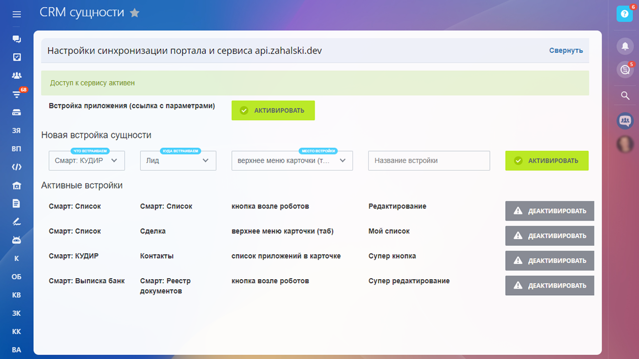 - Список приложений в карточке CRM сущности;