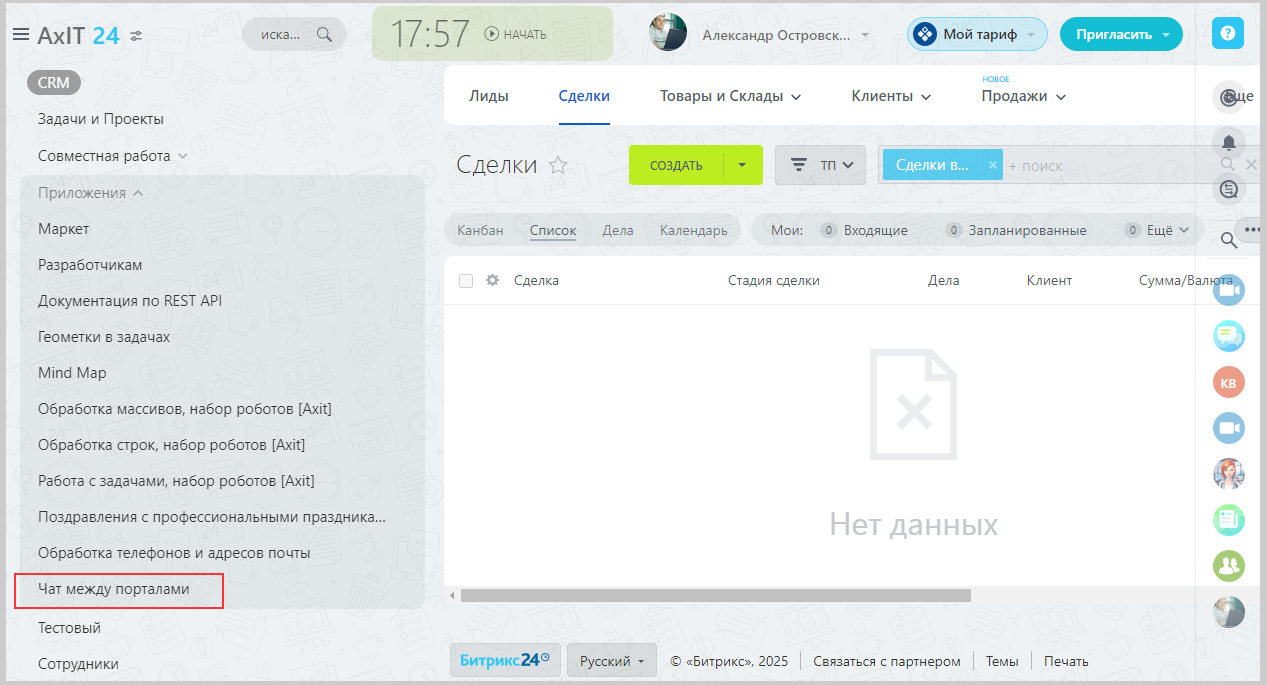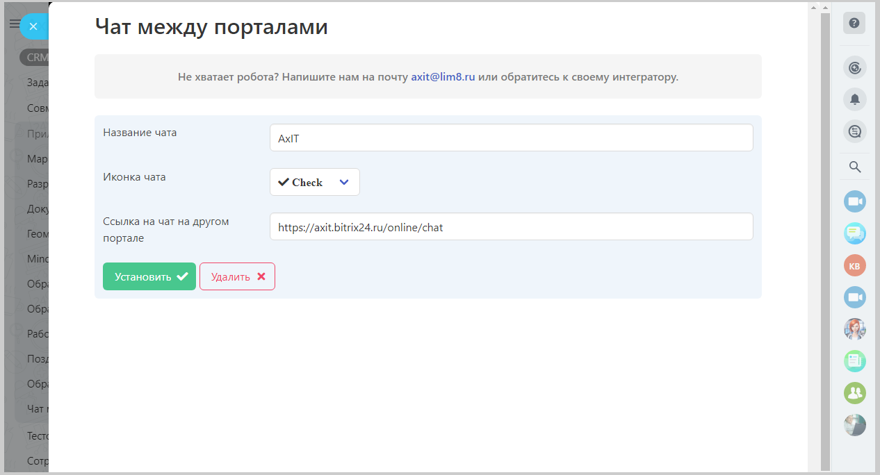 - Установите приложение, после чего появится новый пункт в левом меню, в разделе "Приложения" - "Чат между порталами" (см. скрин №1).