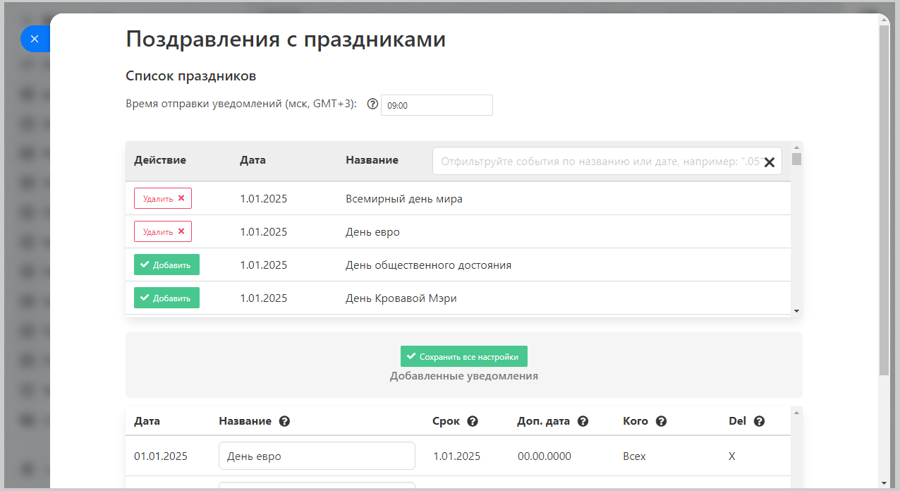 Важно! Возможны пиковые нагрузки в моменты отправок уведомлений, поэтому уведомления могут приходить не в точное время, а немножко сдвигаться, учитывайте этот момент при настройке времени. - Название праздника. По этому полю можно искать в фильтре (п.14).