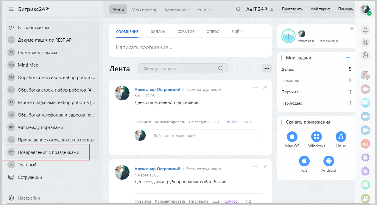 - Установите приложение, после чего появится новый пункт в левом меню, в разделе "Приложения" - "Поздравления с праздниками" (см. скрин №1).