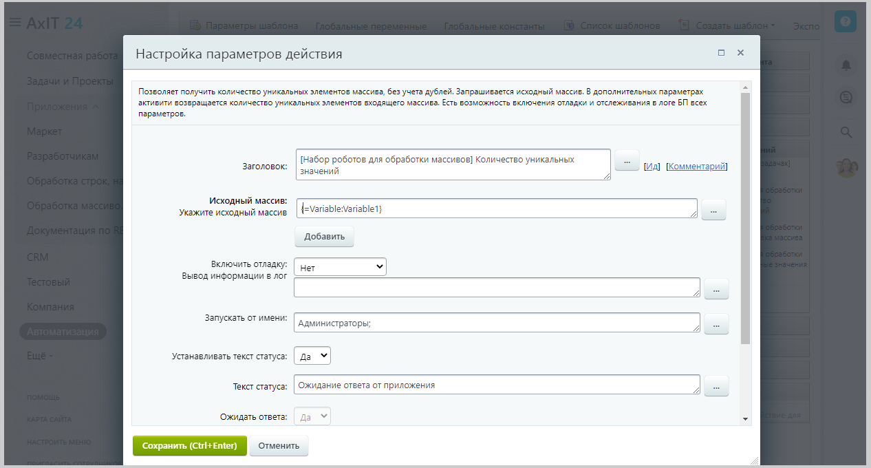 Позволяет получить количество уникальных элементов массива, без учета дублей. Запрашивается исходный массив. В дополнительных параметрах активити возвращается количество уникальных элементов входящего массива. Есть возможность включения отладки и отслеживания в логе БП всех параметров.