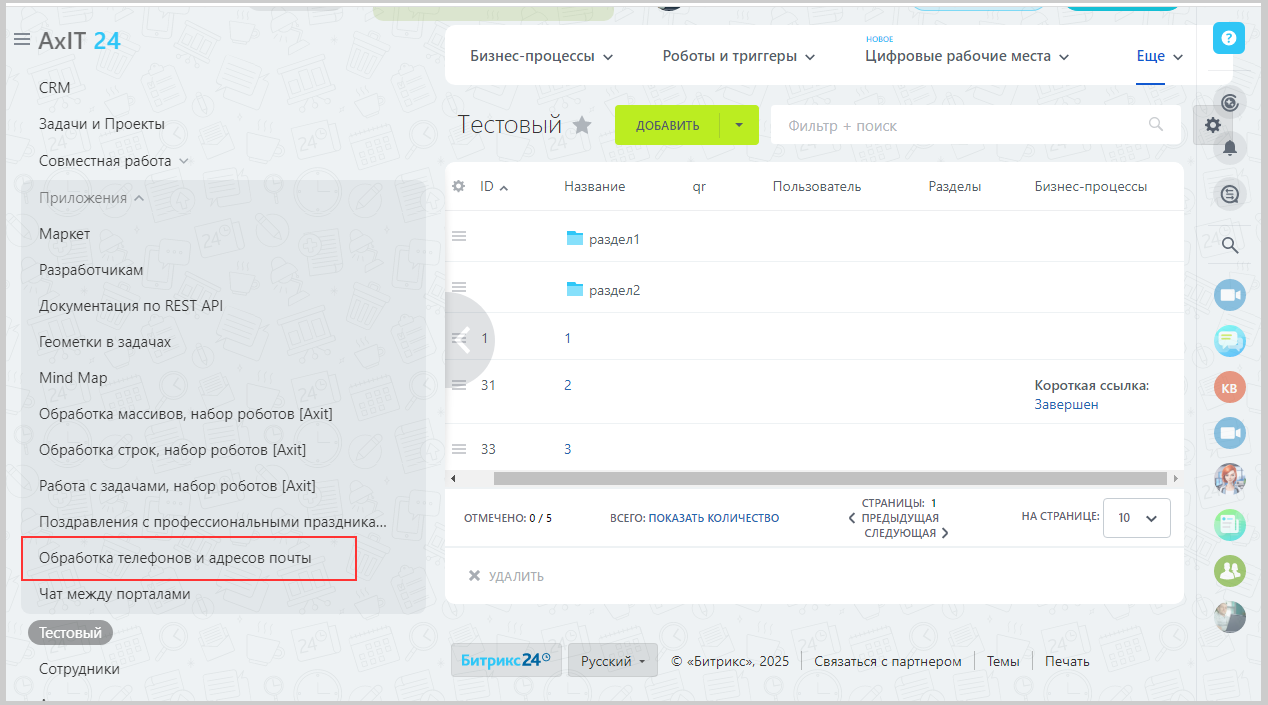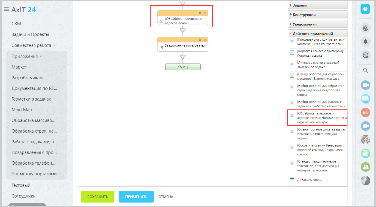 1. Установите приложение, после чего появится новый пункт в левом меню, в разделе "Приложения" - "Обработка телефонов и адресов почты" (см. скрин №1).