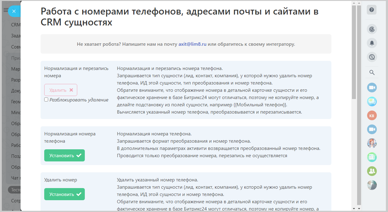 Преобразование номеров телефонов, удаление выбранных или всех телефонов, почтовых адресов и сайтов в лидах, контактах и компаниях.