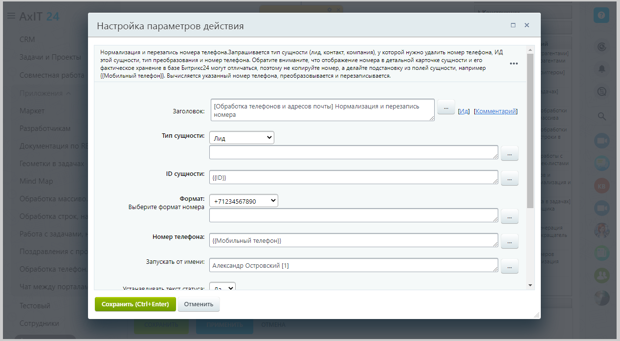 В поле "Номер телефона" указать номер, который нужно преобразовать. Обращаем внимание, что в Битрикс24 отображение номеров телефонов в детальной карточке сущности может отличаться от фактического формата хранения номеров, поэтому не копируйте номер, а используйте подстановку мета символов, например, {{Мобильный телефон}}.