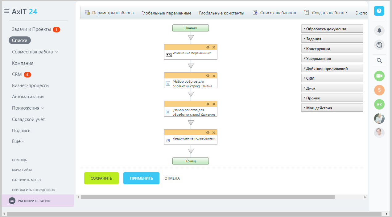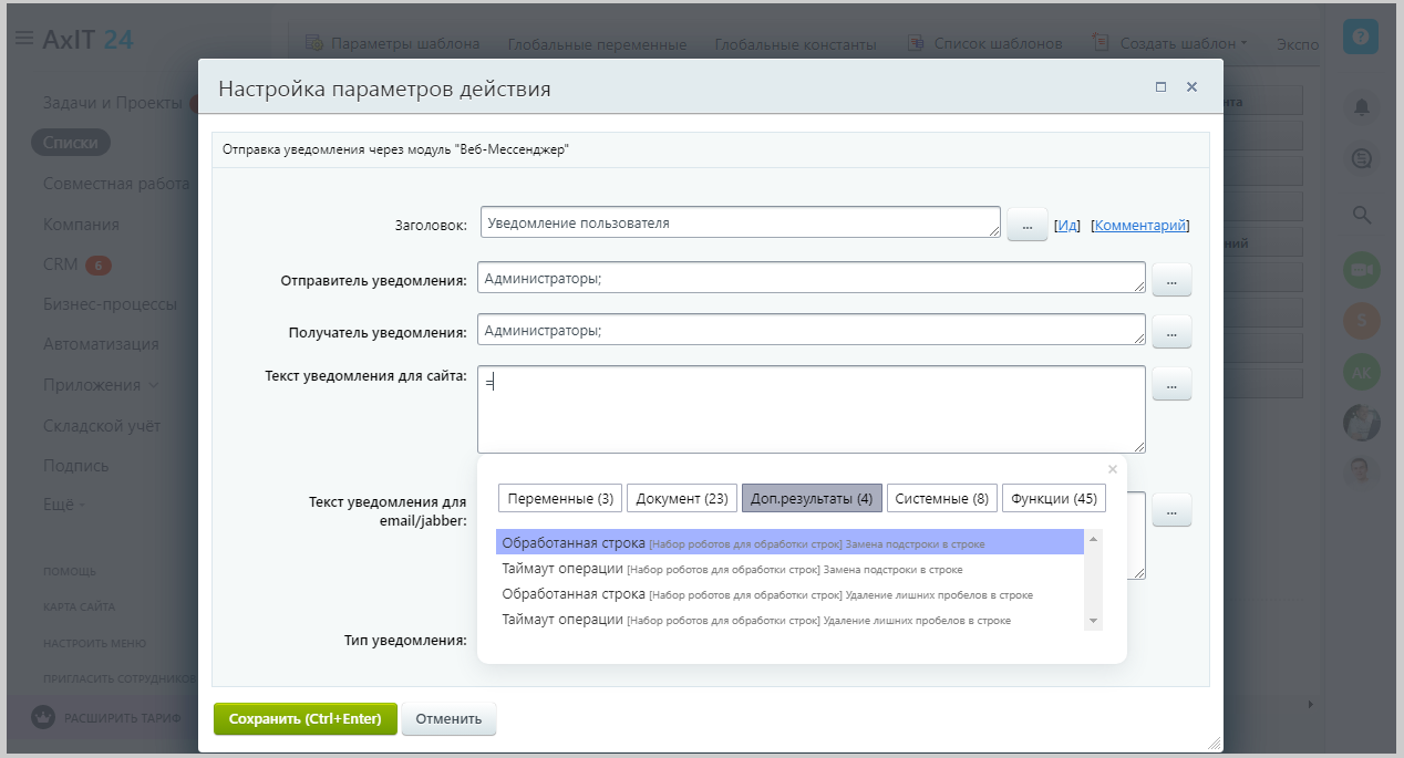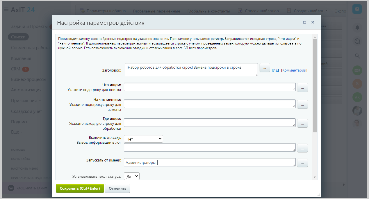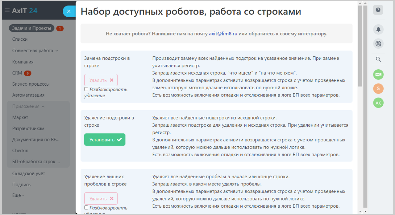 В какой-то момент количество таких проблем переполнило чашу терпения, и мы решили выпустить набор активити для работы со строками, в него входят основные действия, которые мы встречали в своей практике и которые не были реализованы в штатном функционале Битрикс24.