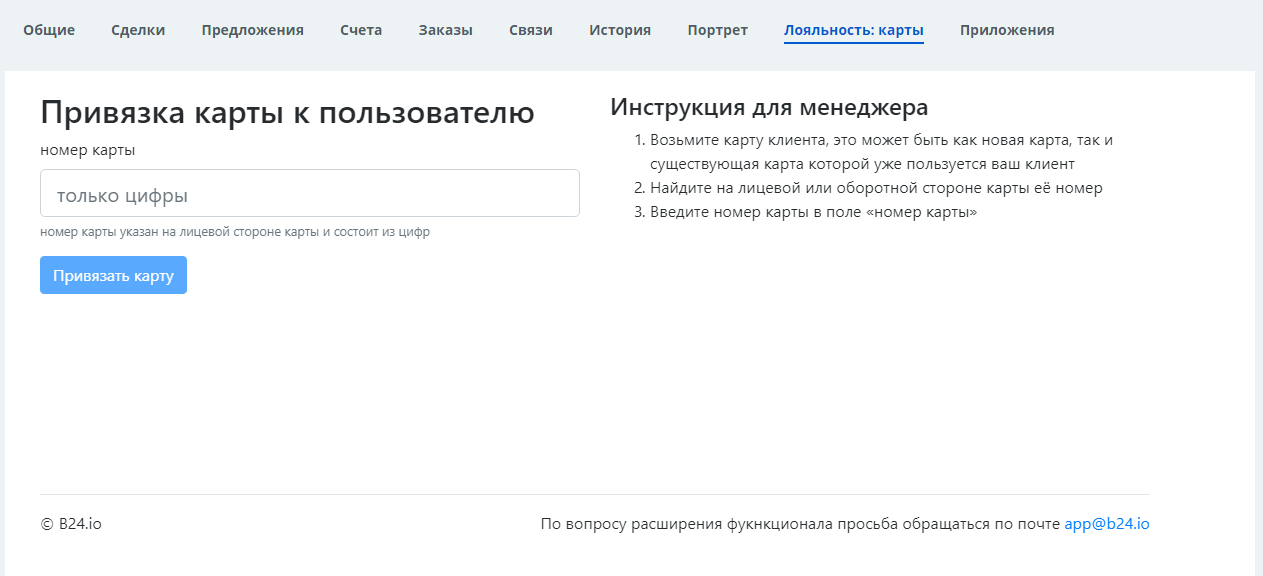 Если у контакта в Битрикс24 нет карты, то при загрузке плейсмента «Лояльность: карты» будет предложено добавить для контакта карту.
