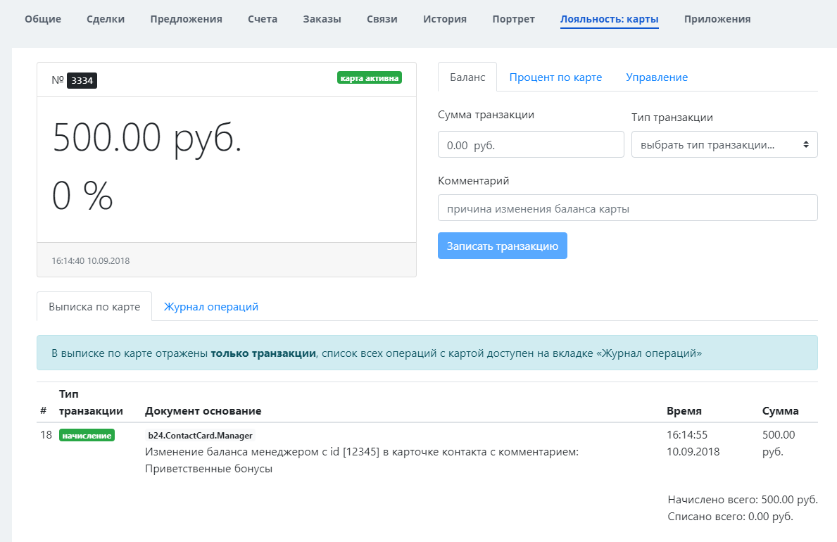 Начисление и списание с баланса карты через интерфейс приложения в карточке клиента в Битрикс24