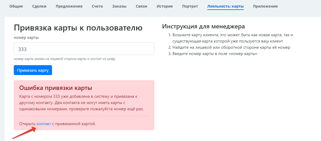 Если номер карты занят другим контактом, то приложение сообщит об этом и не даст создать дубль.