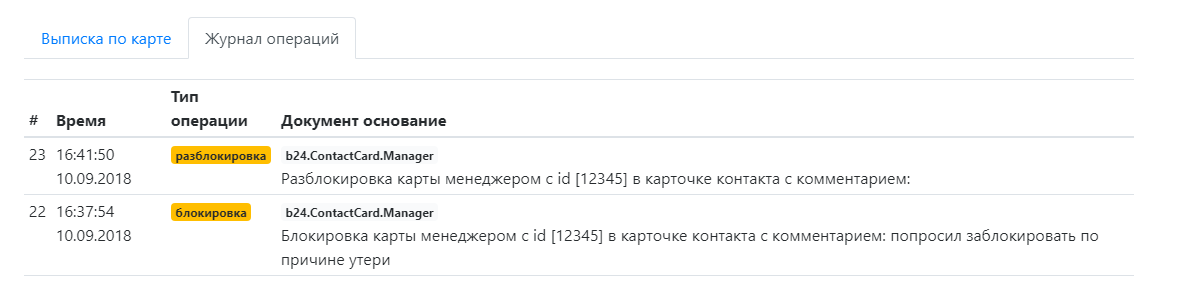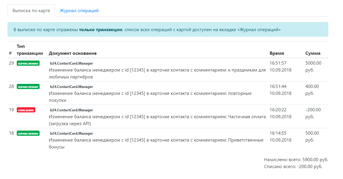 В выписке по карте указывается тип, сумма операции и документ-основание. Например, ручная корректировка менеджером.
