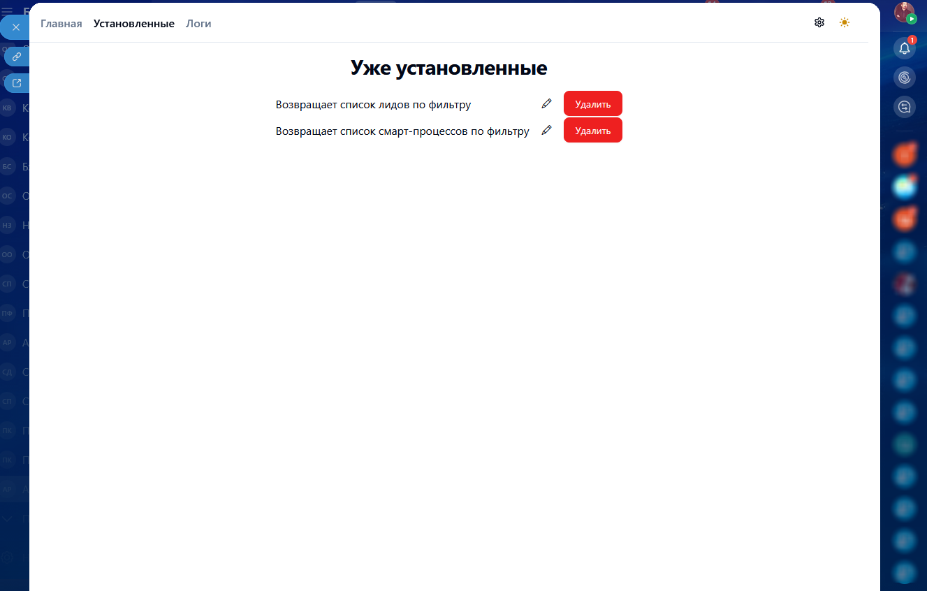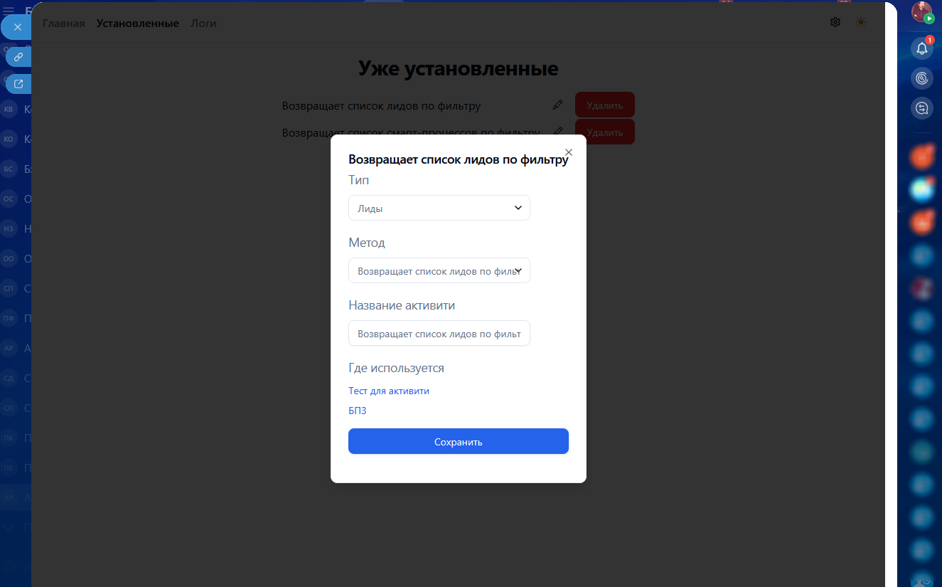 • Просмотр уже установленных активити (возможность отредактировать или удалить);