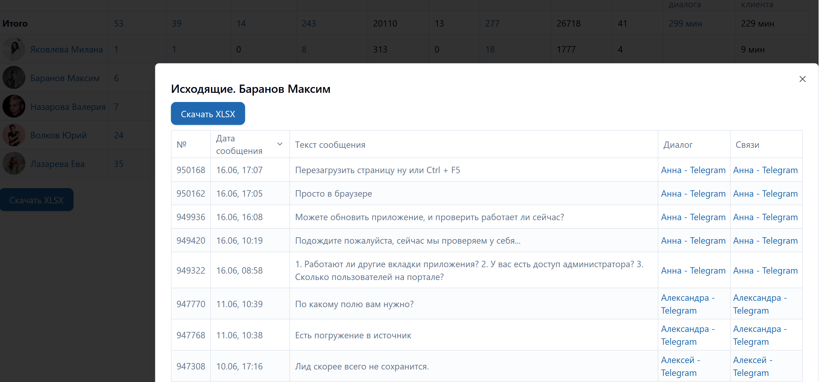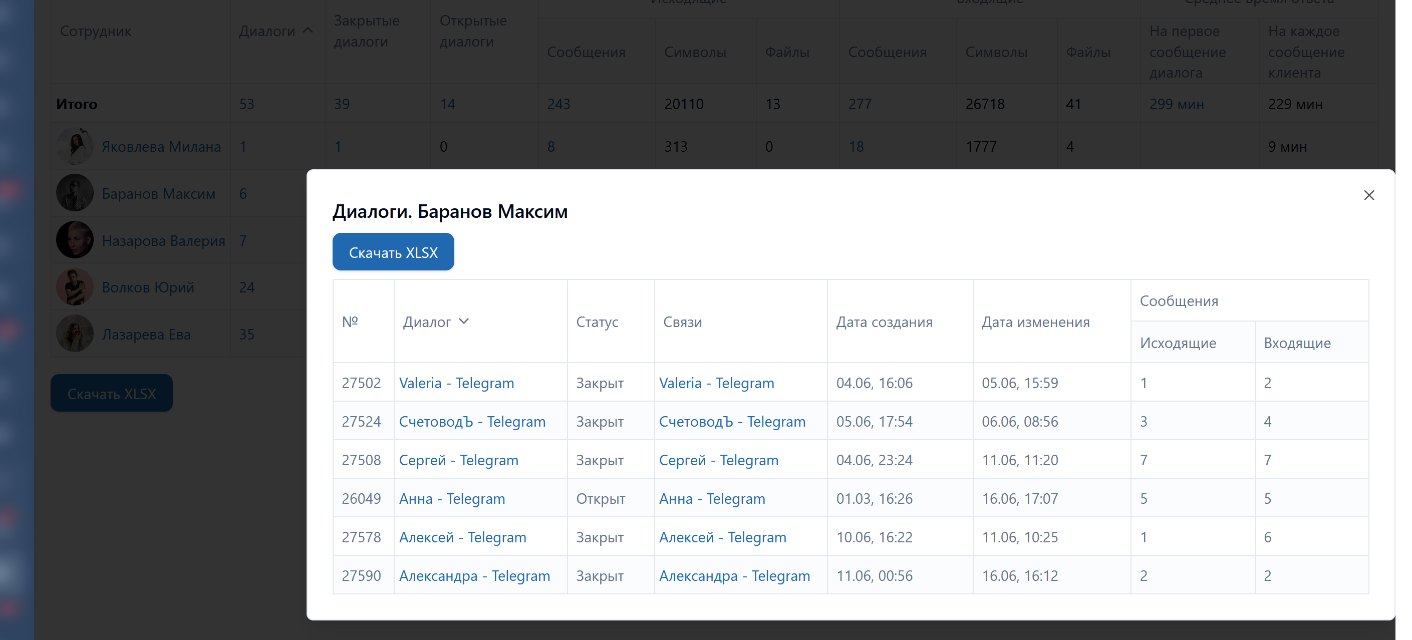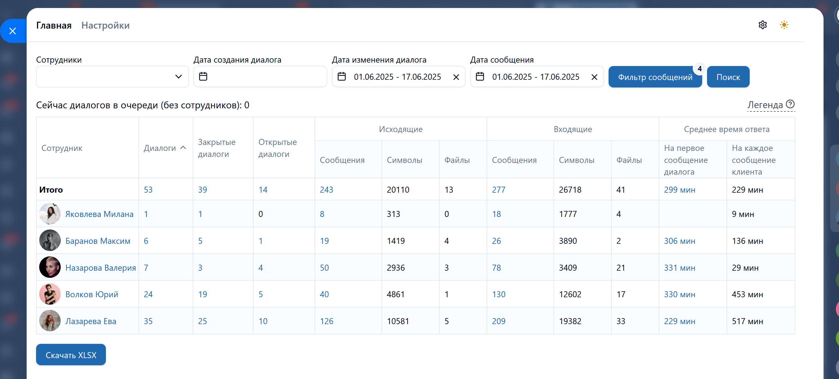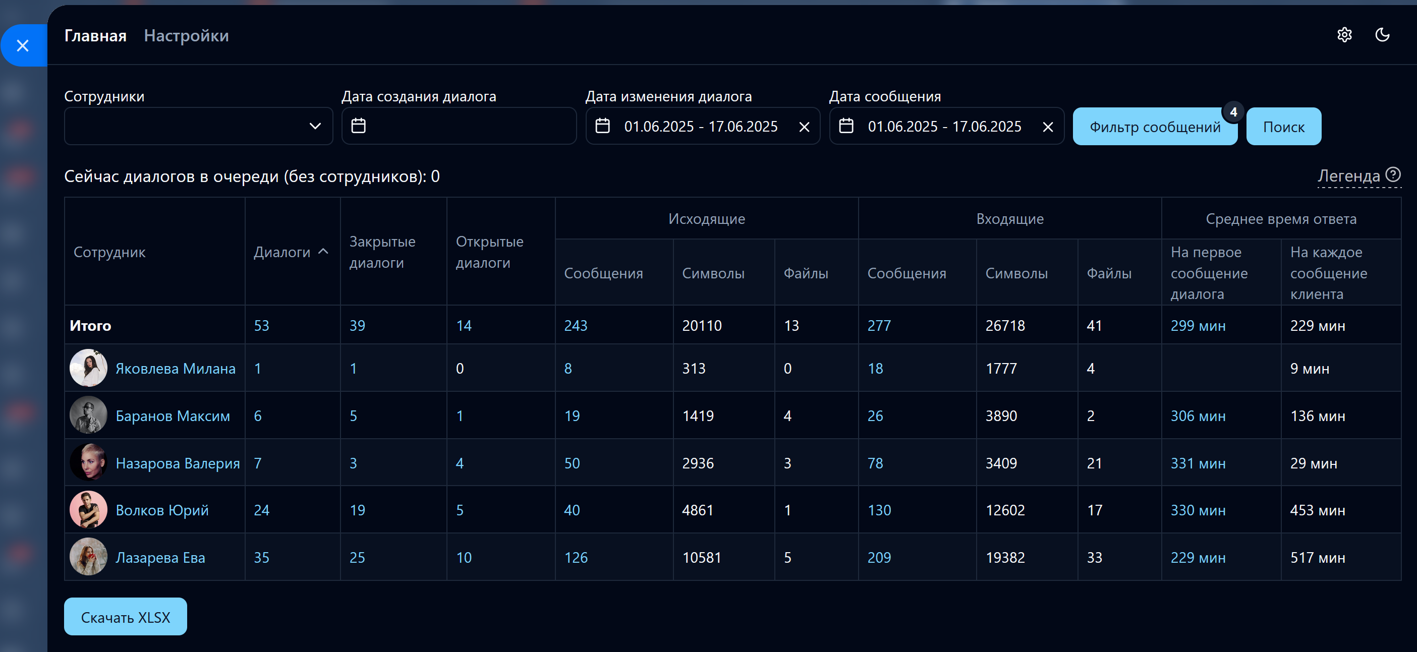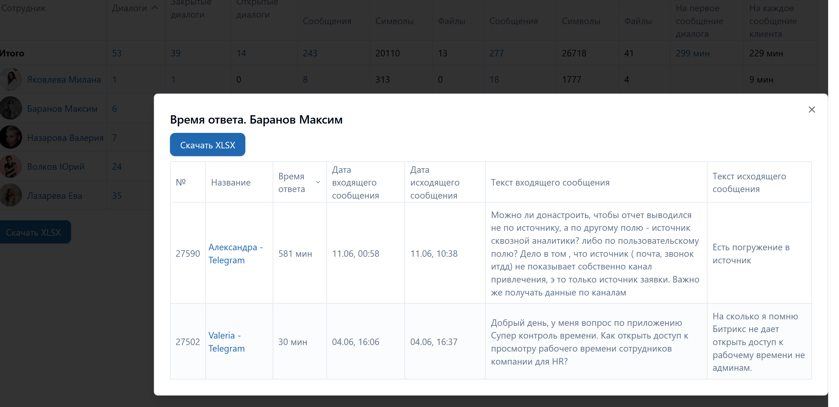 • Формирует детальную таблицу по диалогам сотрудников с указанием количества: диалогов (всех), закрытых диалогов, открытых диалогов, исходящих (сообщений, символов, файлов), входящих (сообщений, символов, файлов), среднего времени ответа (на первое сообщение диалога, на каждое сообщение клиента);