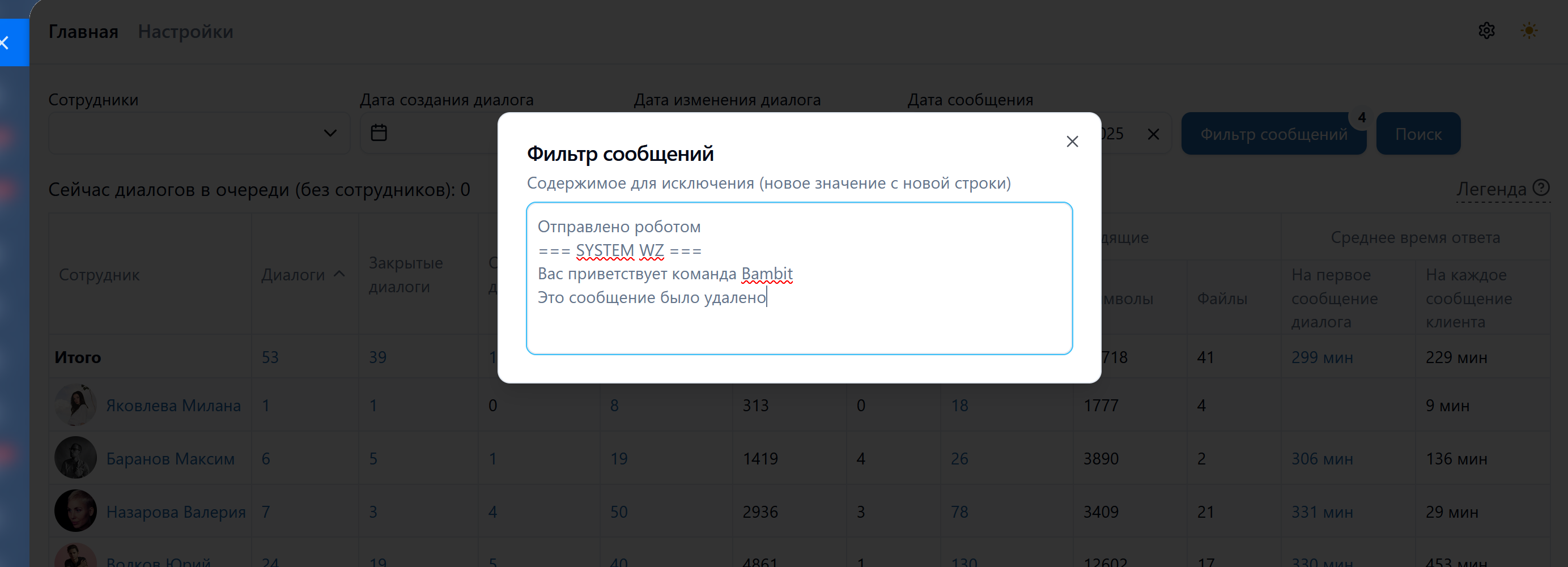 • Если сотрудник когда-либо участвовал в диалоге, то диалог числится за сотрудником.