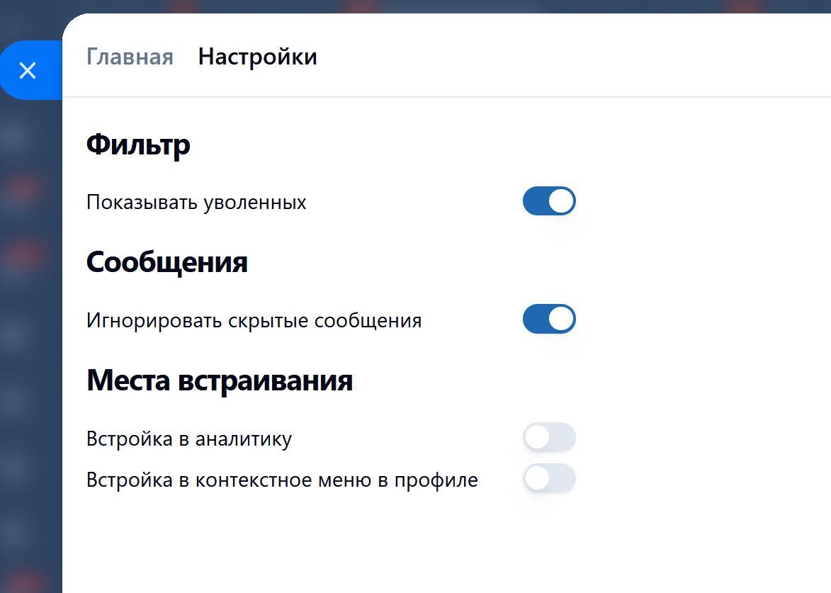 • Скрывать/показывать уволенных сотрудников;
