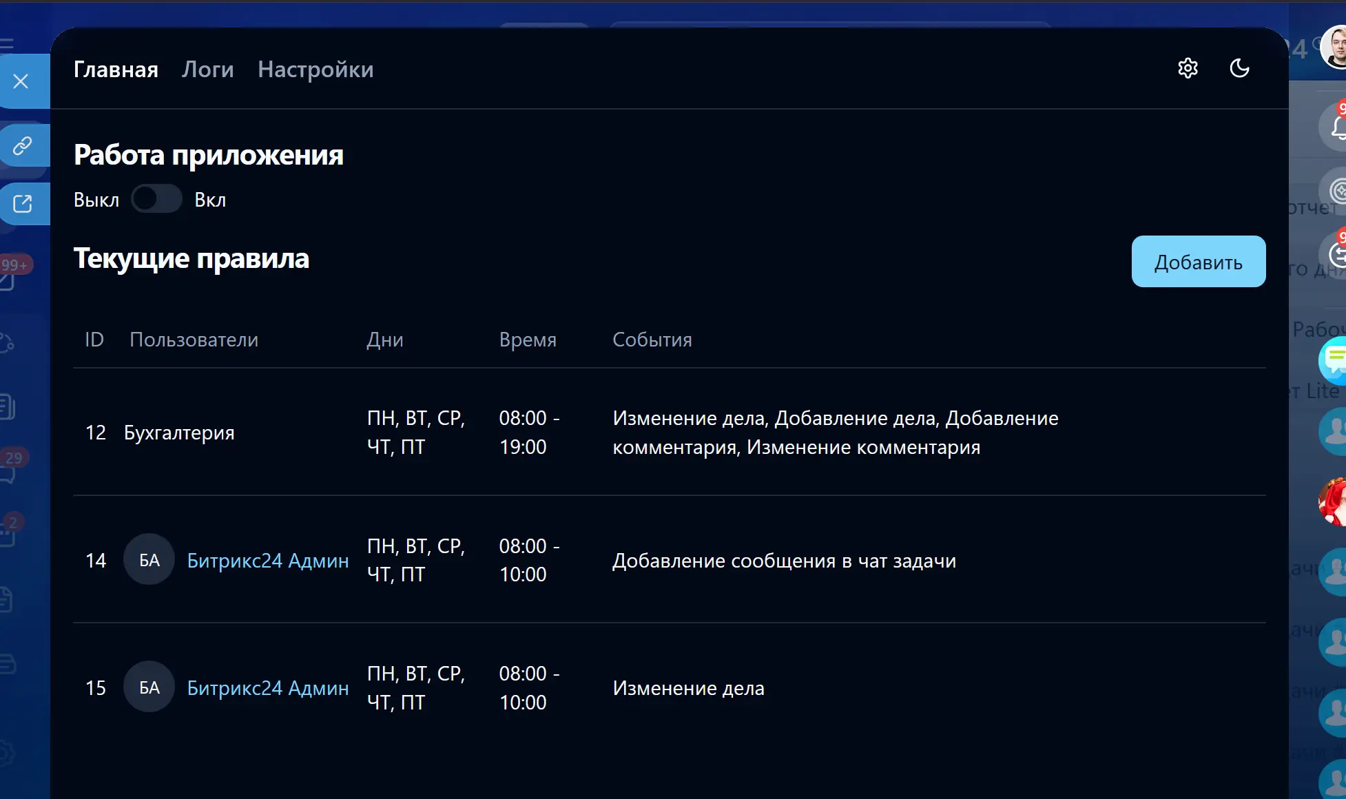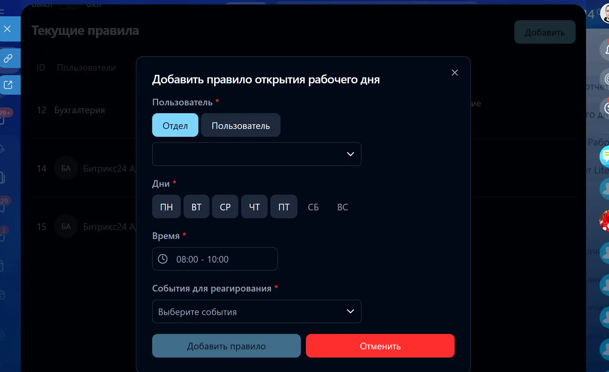 • Время: со скольки до скольки включать рабочий день (слушать события);