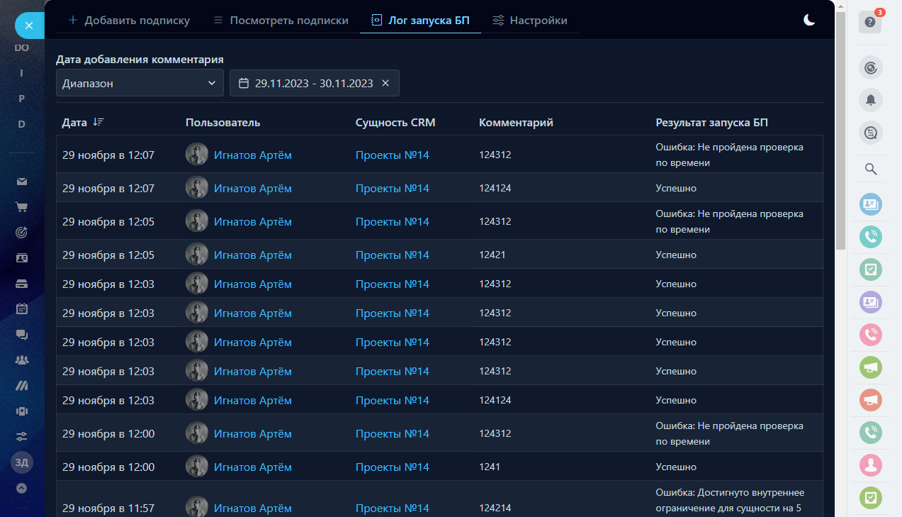 - Если у сущности запущено уже 2 бизнес-процесса, то в логах вы найдете ошибку;
