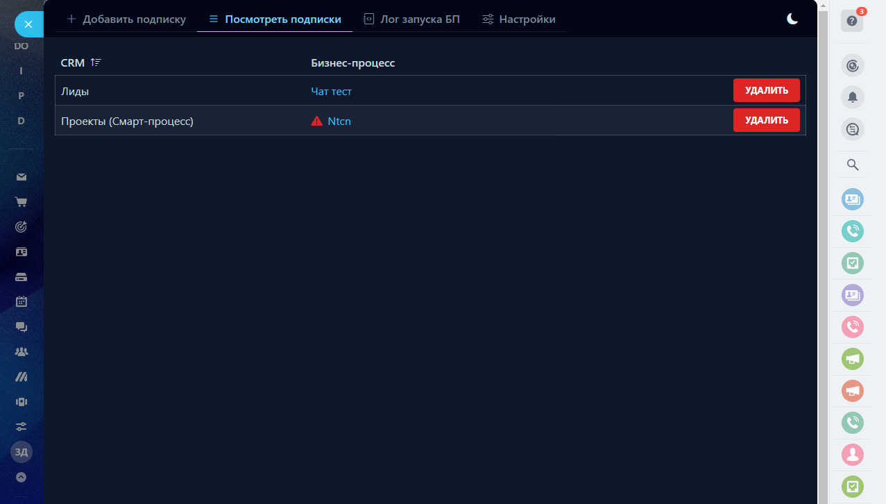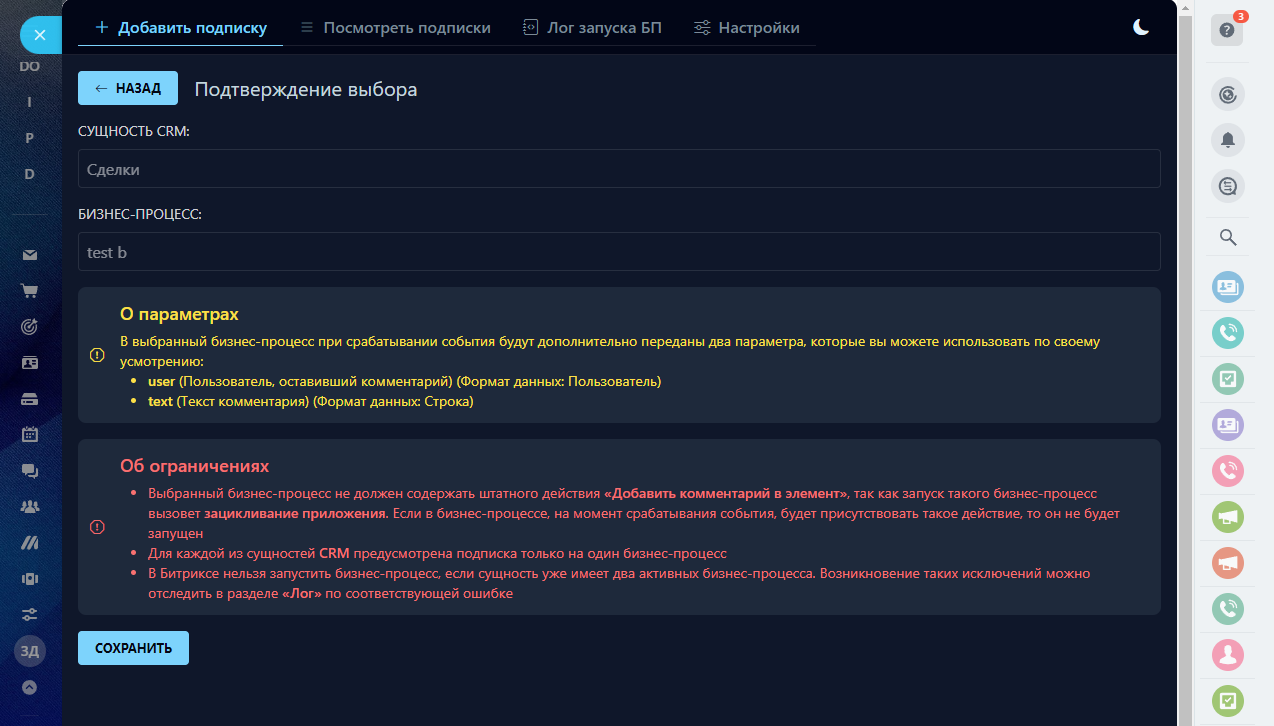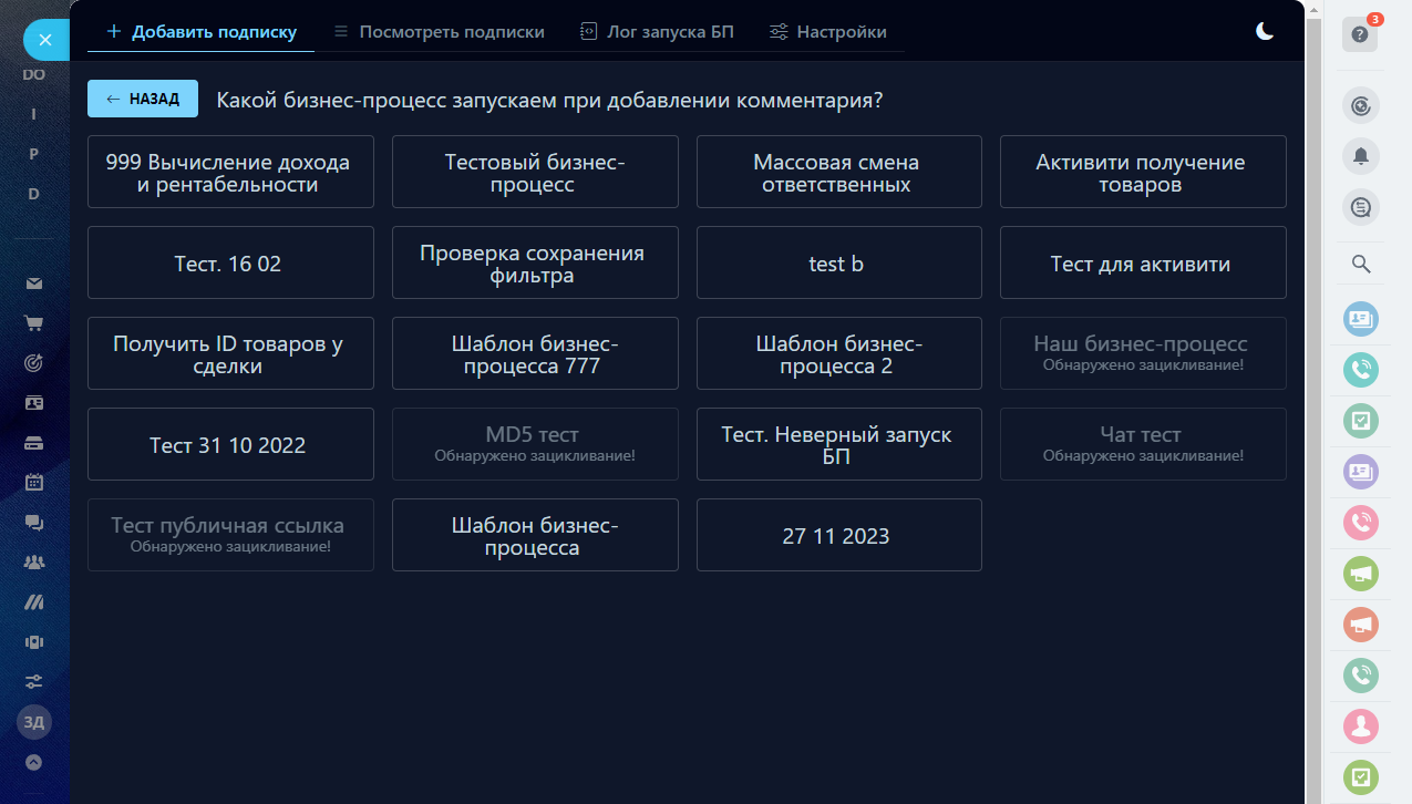 - Рекомендуем не использовать в бизнес-процессе паузы/цикл, чтобы бизнес-процесс отрабатывал сразу;