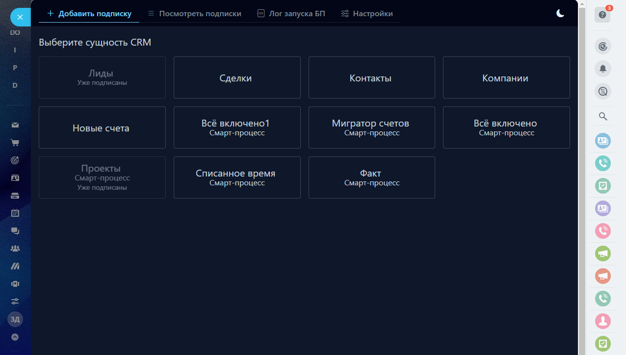 - Выберите сущность где есть таймлайн (Лид, Сделка, Контакт, Компания, Счет, Коммерческое предложение, Смарт-процесс);