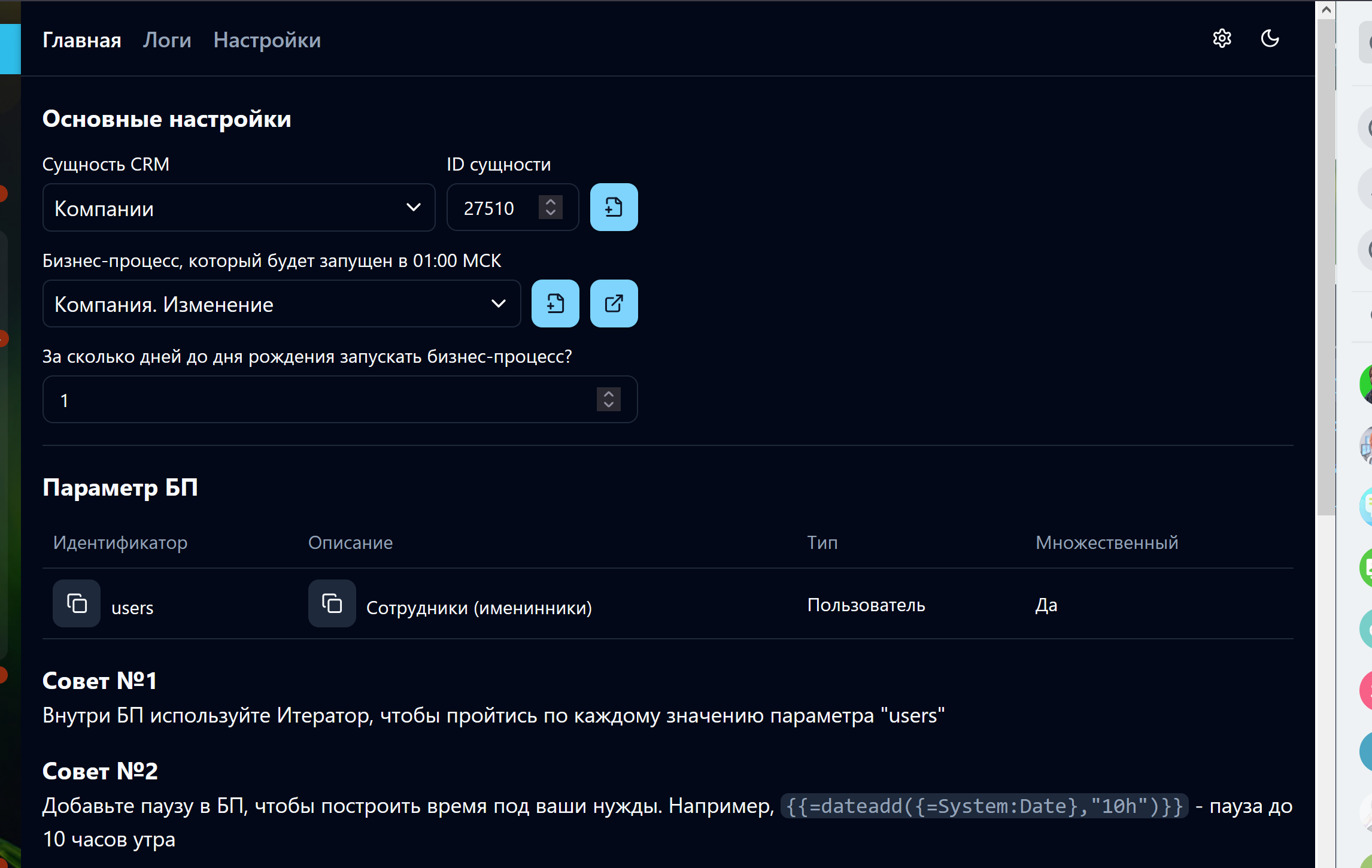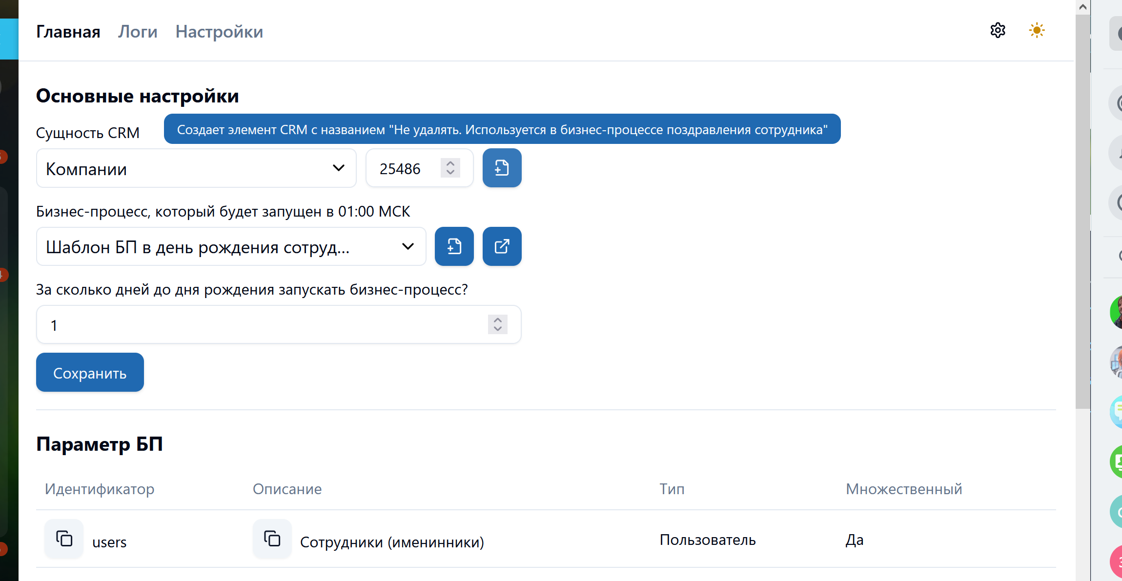 - Задайте за сколько дней до дня рождения запускать бизнес-процесс;