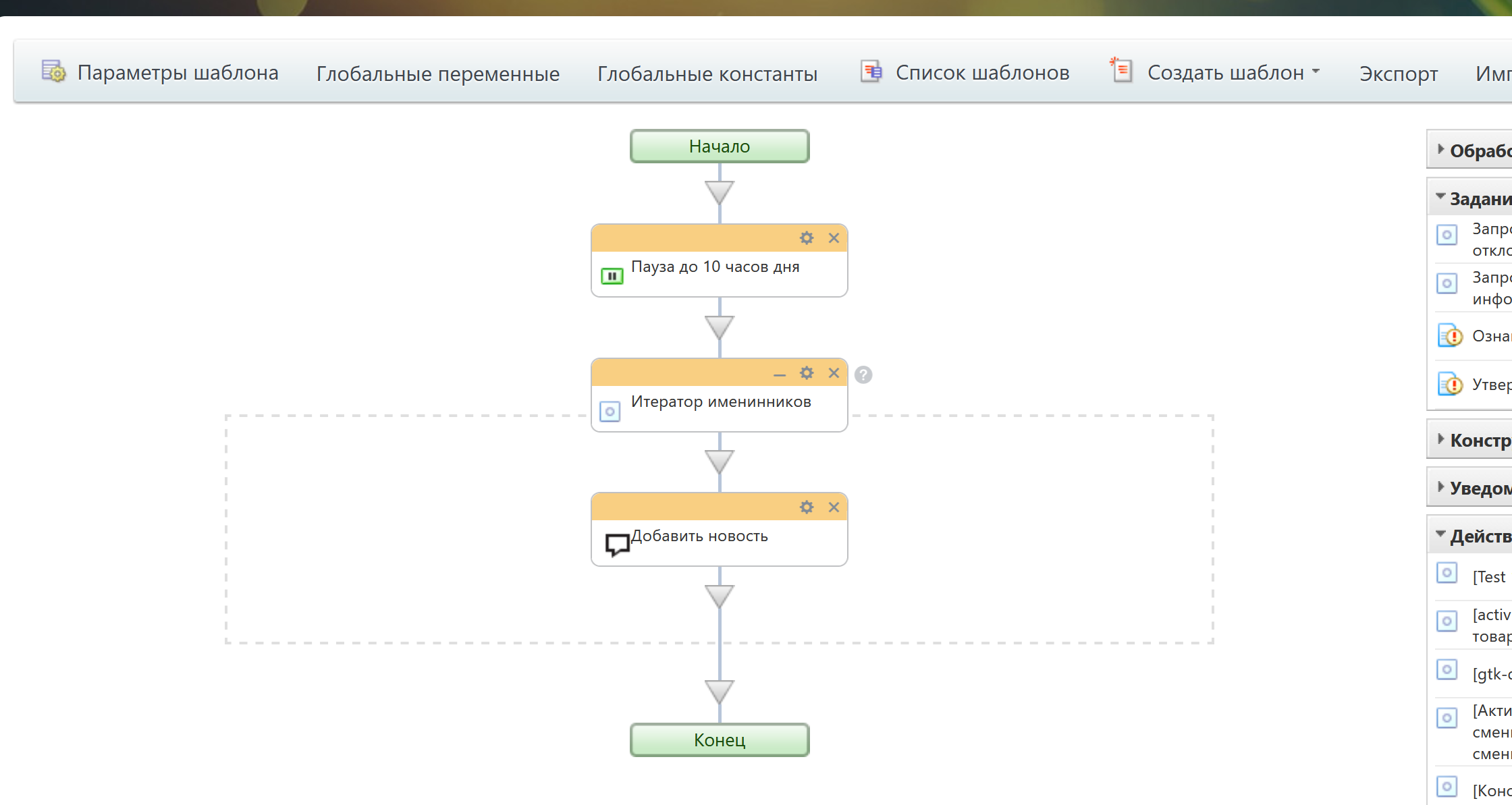 - Выбрать свою логику. Например, поставить задачу, отправить сообщение в Ленту новостей, отправить сообщение в общий чат;